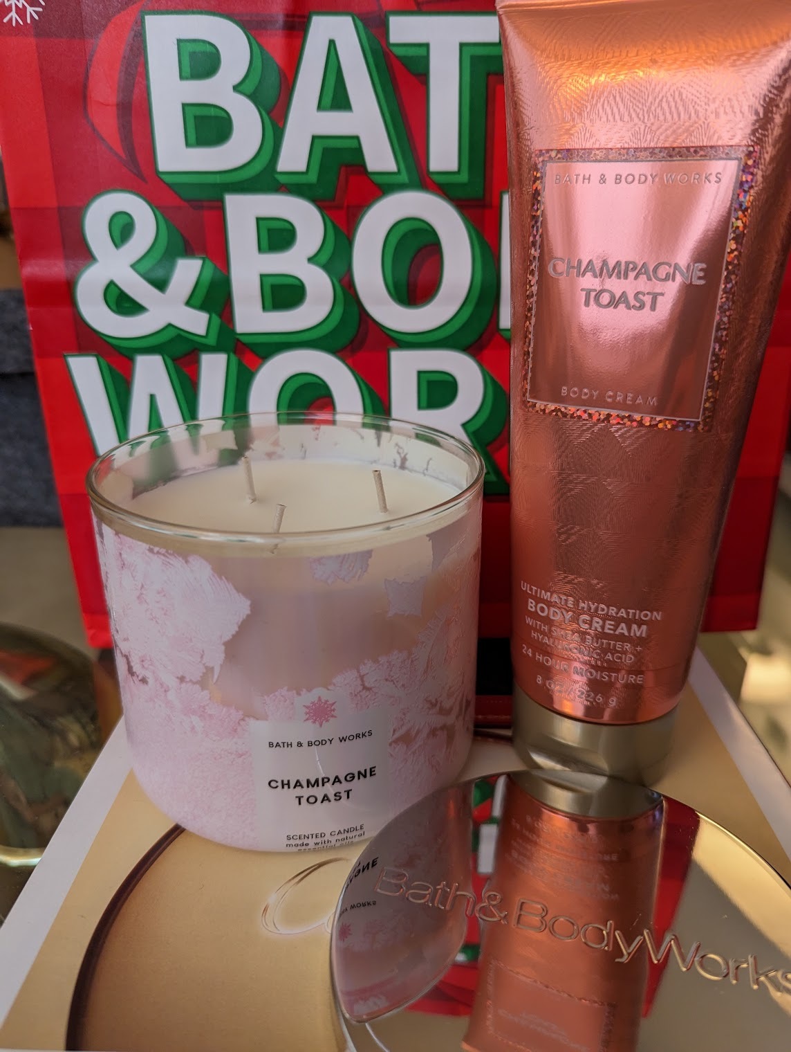 먼저 가장 애정하는 샴페인 토스트(Champagne Toast)입니다. 향초도 있고 몇주 전 쿠폰으로 받은 바디 크림도 있어요. 향도 취저, 패키징도 취저입니다. 이 향초는 기본 디자인이 아니고 시즌 한정 디자인이에요. 워낙 스테디셀링 향이라서 주기적으로 새로운 디자인으로 리뉴얼된답니다.