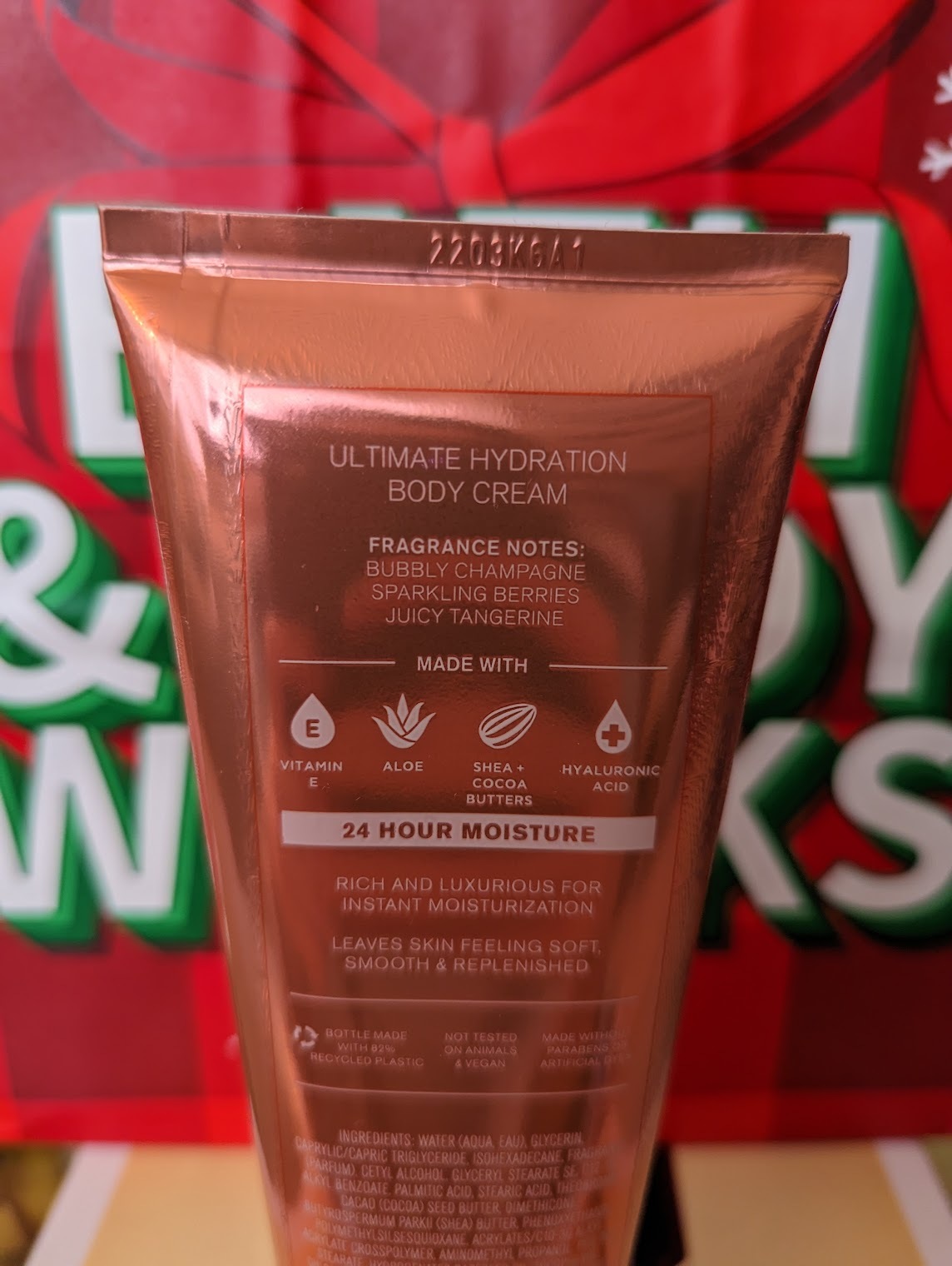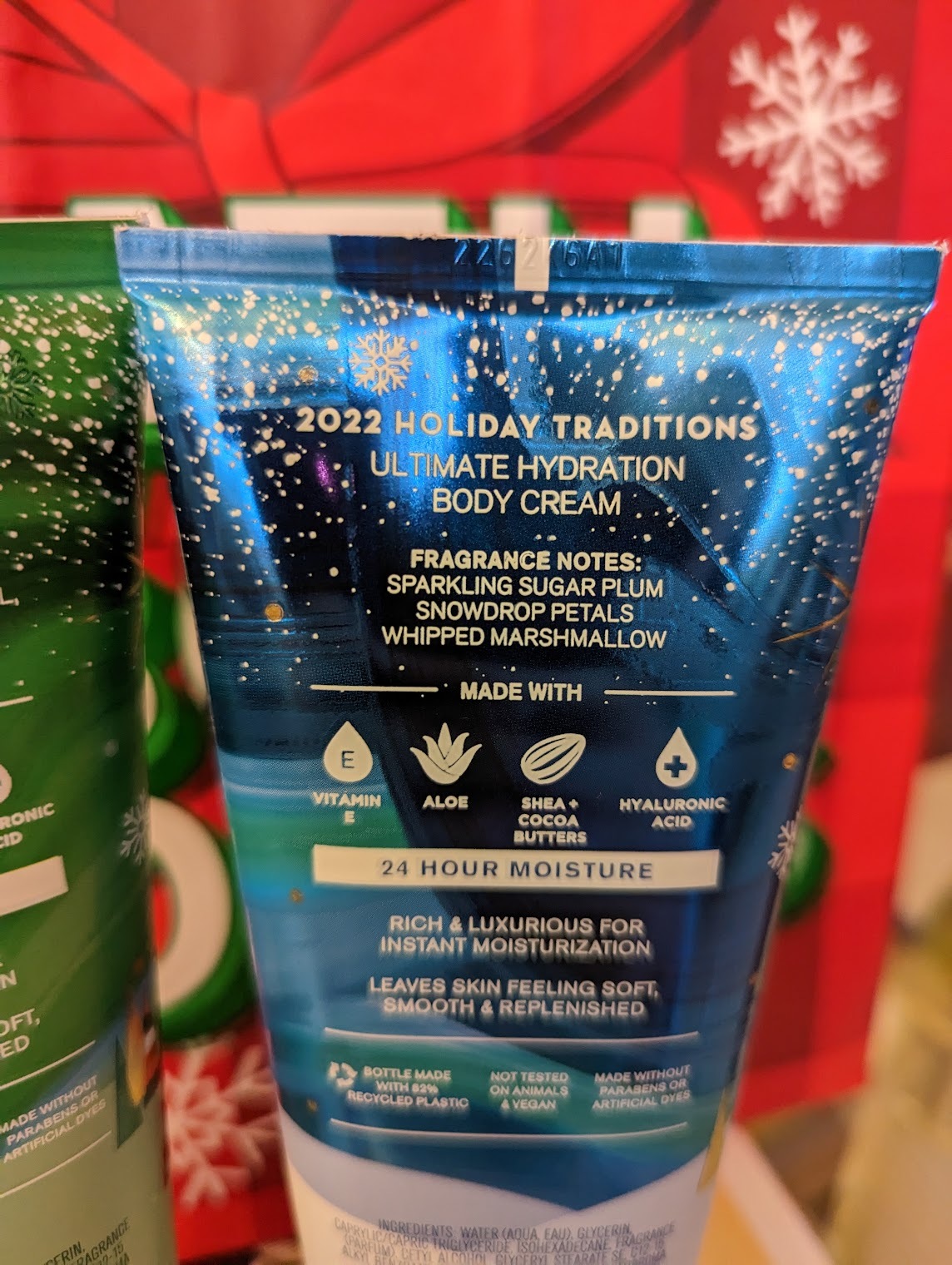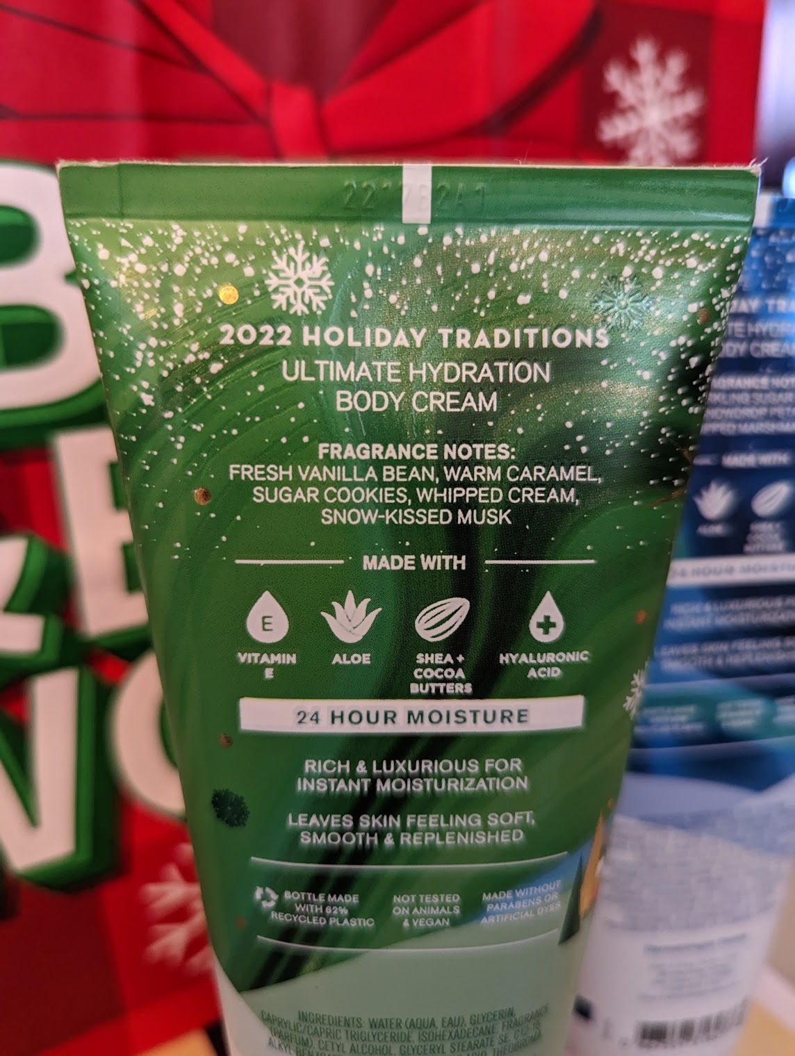 바닐라빈 노엘 먼저 보겠습니다. 프레시 바닐라빈, 따뜻한 카라멜, 슈거 쿠키, 휘핑 크림, 눈에 닿은 머스크(???) 라고 적혀 있는데 이건 뭐 바디크림이라기 보다는 디저트인줄 알겠네요. 생각보다 그렇게 대놓고 디저트향은 아니니 안심하시고요. 휘핑크림 향은 잘 모르겠지만 달달하고 바닐라, 카라멜 느낌이 나는 향이에요. 머스크는 별로 강하지 않은 것 같아요. 찾아보니 빌리 아일리시 향수와 향이 비슷하다는 리뷰가 많네요.