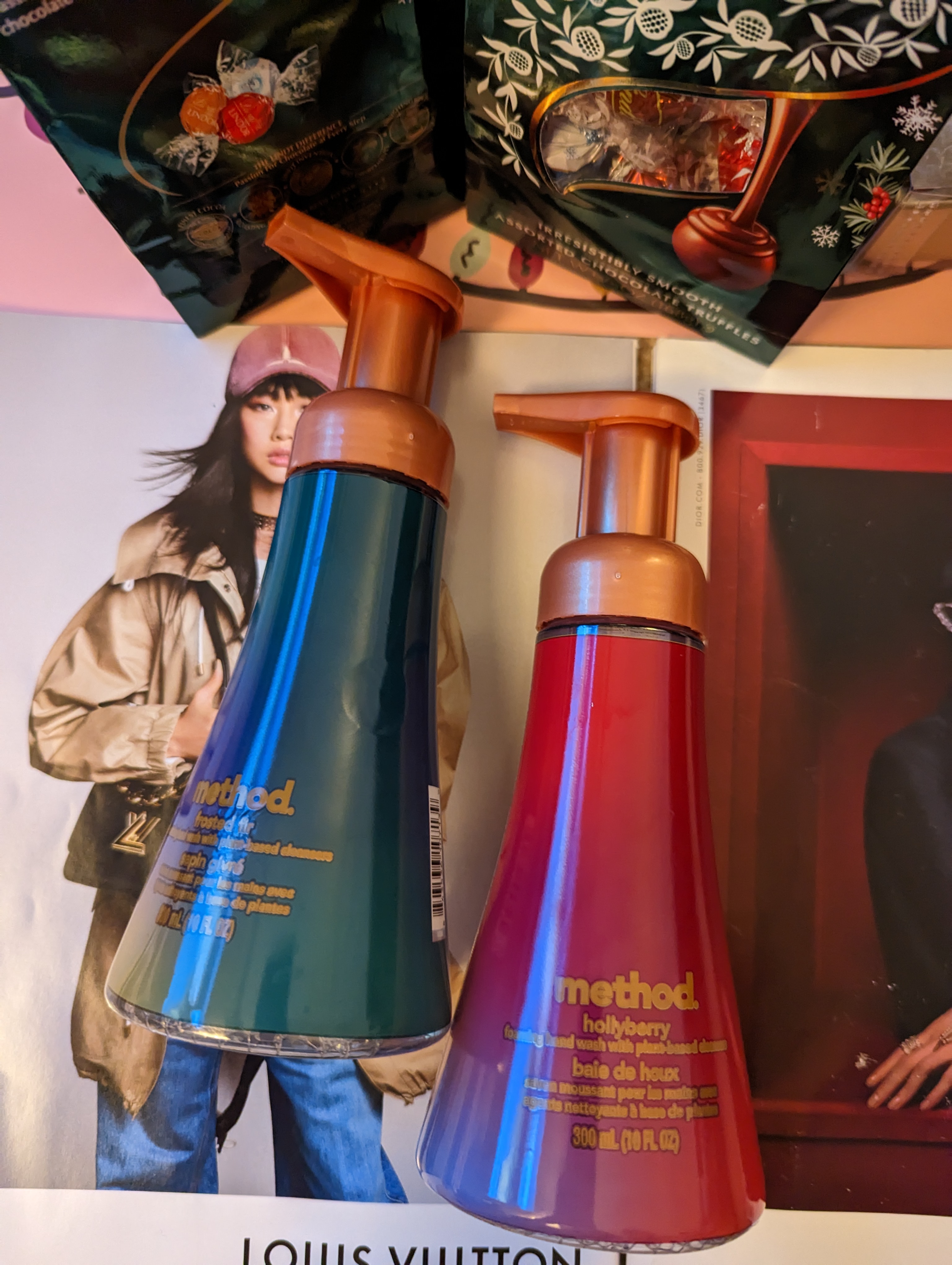 다음은 우리나라에서도 쉽게 보실 수 있는 메쏘드(Method) 핸드워시인데요, 1.64달러라는 말도 안되는 가격이라 그냥 묻지도 따지지도 않고 사왔습니다. 정가는 4.49였네요. 홀리데이 한정판 홀리베리 향 및 크리스마스 트리향이고요, 크리스마스가 지났어도 기분 좋게 사용할 수 있는 향이에요. 계면활성제가 포함되어 있어서 살짝 아쉽긴 합니다.