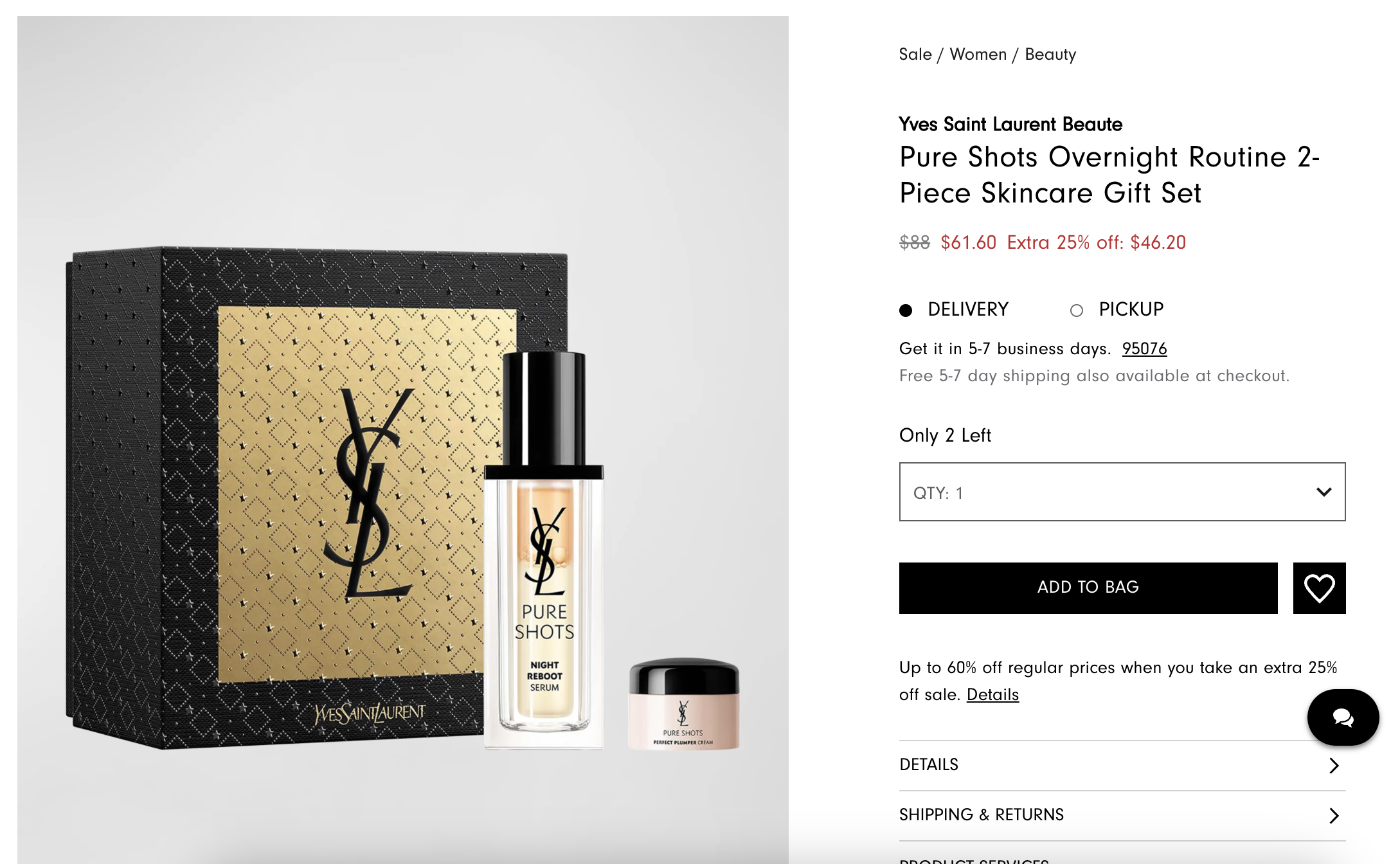 내친김에 아직도 재고가 있는 몇몇 명품뷰티 굿딜 소개해드릴게요. YSL 퓨어샷 오버나이트 루틴 스킨케어 세트가 추가 할인 적용해서 46달러입니다. 역시 니먼마커스에서 판매중이고요, 선물용으로 딱일 것 같아요. 참고로 같은 구성이라도 백화점에 따라 가격차가 꽤 됩니다. 지금 다른 백화점들에서는 똑같은 제품을 61달러에 판매중이에요.