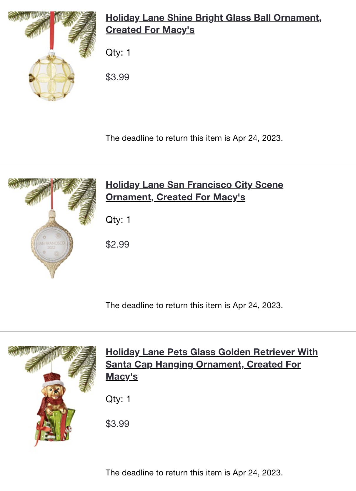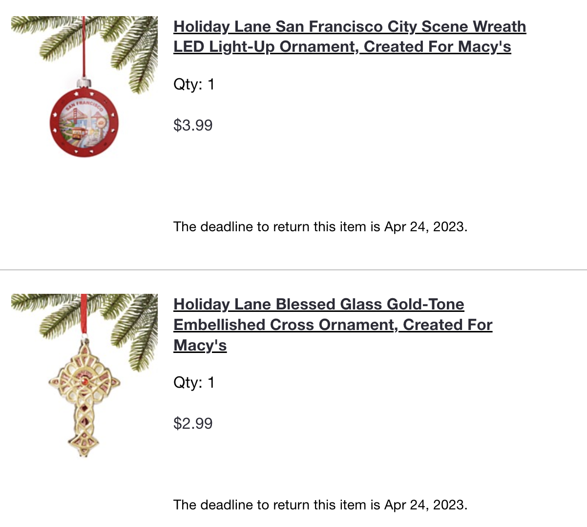 안녕하세요, 오들입니다. 오늘도 애프터 크리스마스 세일 득템 포스팅인데요, 이번에는 크리스마스 트리 오나먼트를 몇개 장만해 봤어요. 저는 메이씨즈(Macy's)에서 온라인으로 구매했고요, 27일 주문한 제품들이 1월 7일-9일에야 왔으니 거의 보름 후에 도착했네요. 뭐 올해 쓸 것도 아니고 요즘 캘리포니아 날씨가 워낙 홍수다 뭐다 해서 난리도 아니었으니 이해는 합니다. 카드로도 유명한 홀마크 스토어라던가, 윌리엄 소노마, 제이씨페니, 콜스 등 웬만한 백화점은 다 크리스마스 오나먼트 세일을 해요. 할인폭도 50%부터 60, 심지어 75%까지 크리스마스 오나먼트는 일년 중 이때가 제일 저렴한 것 같습니다.