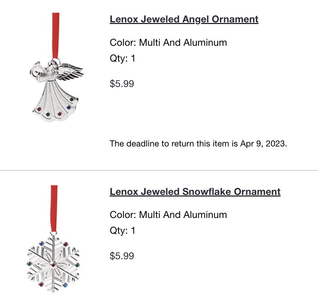 여기까지 쓰고 마무리하려고 했는데 다행히 나머지 오나먼트가 무사히 도착해줬네요! 레녹스 제품이고 세일 가격은 각각 6달러였어요. 정가는 20달러입니다. 레녹스 오나먼트는 어떤 느낌일지 궁금해서 주문해 봤네요.