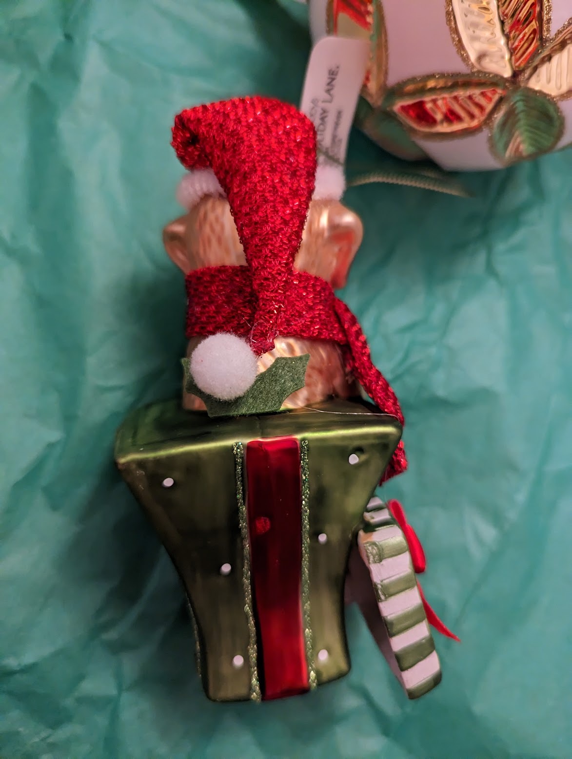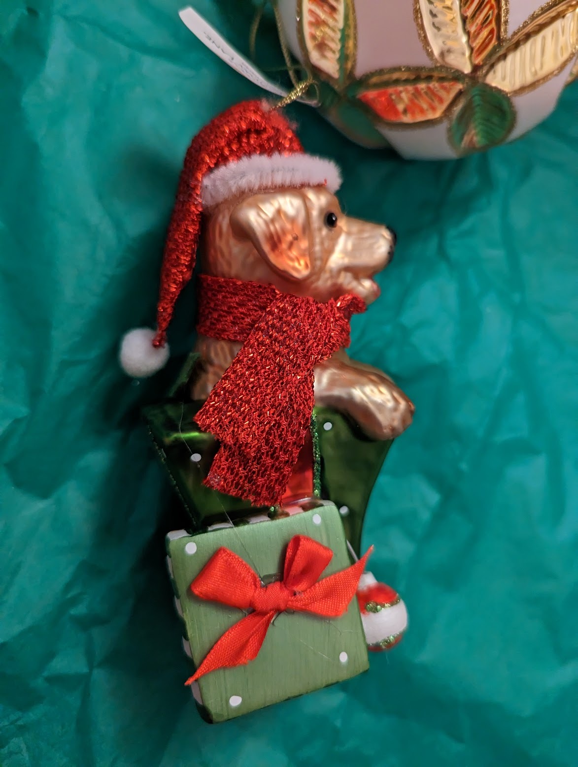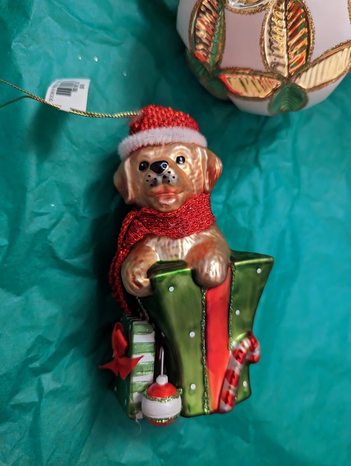 다음은 귀여운 강아지 모양의 오나먼트입니다. 선물 상자 안에서 귀엽게 얼굴을 내미는 모습이에요. 정가로 치면 24달러로 이 아이가 가장 비쌌어요. 세일가는 4달러였습니다. 이건 80% 이상 세일 받아서 샀네요.