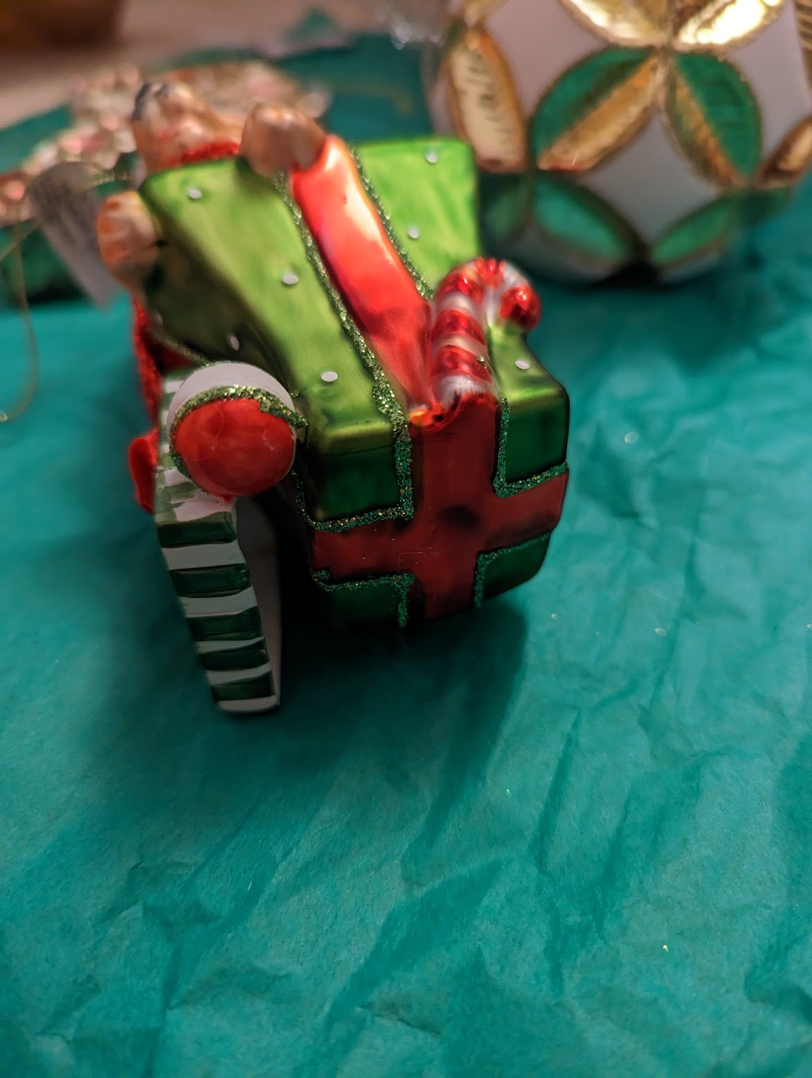 다음은 귀여운 강아지 모양의 오나먼트입니다. 선물 상자 안에서 귀엽게 얼굴을 내미는 모습이에요. 정가로 치면 24달러로 이 아이가 가장 비쌌어요. 세일가는 4달러였습니다. 이건 80% 이상 세일 받아서 샀네요.