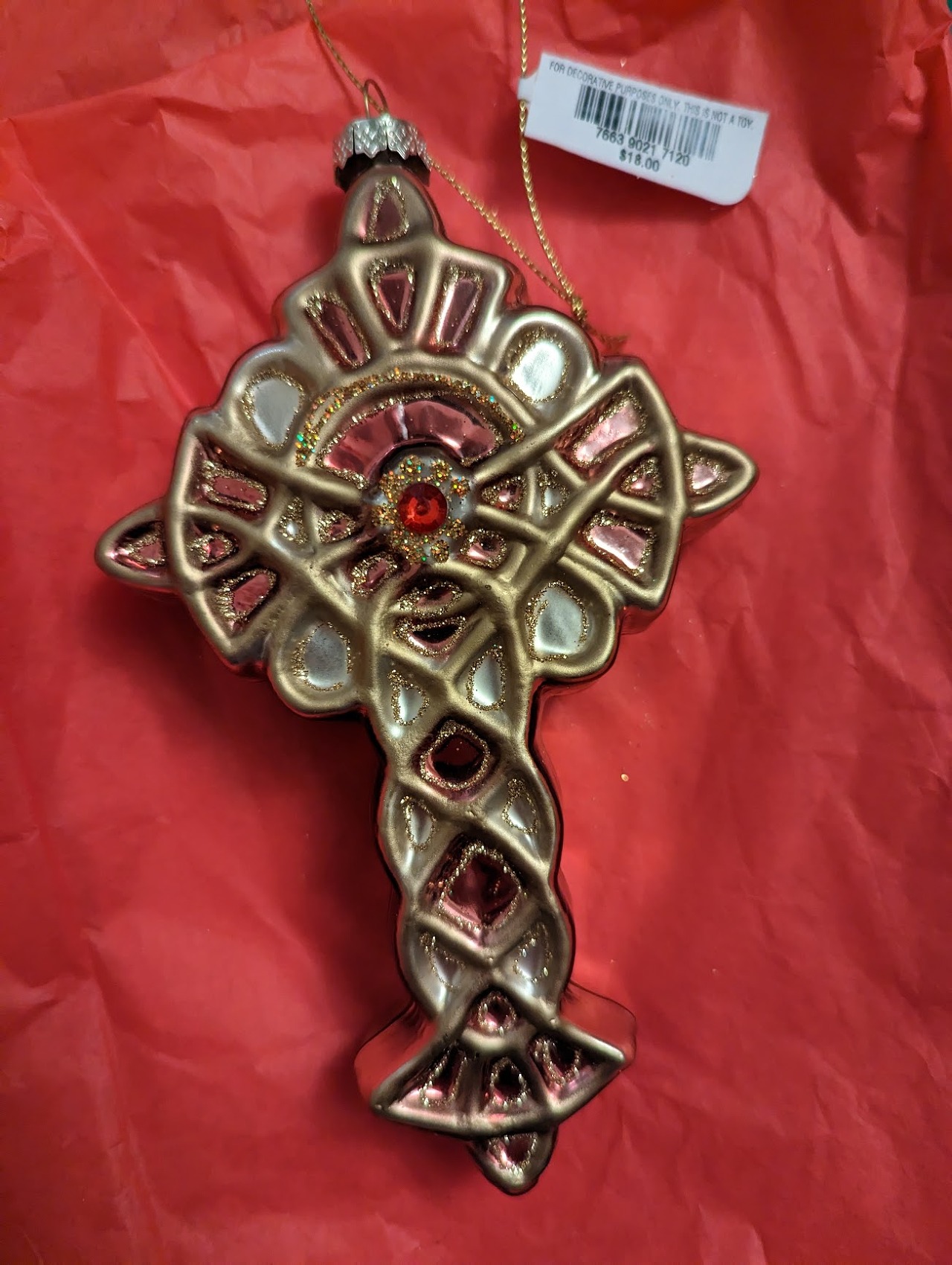십자가 모양의 오나먼트입니다. 유럽교회에서 보던 스테인드 글라스가 연상되는 화려한 느낌이에요. 사진이 좀 어둡게 나왔지만 실제로 보면 반짝이고 예쁘고 다합니다. 정가 18달러 제품을 3달러에 득템했어요. 크기도 꽤 큼직하니 존재감 뿜뿜이네요.