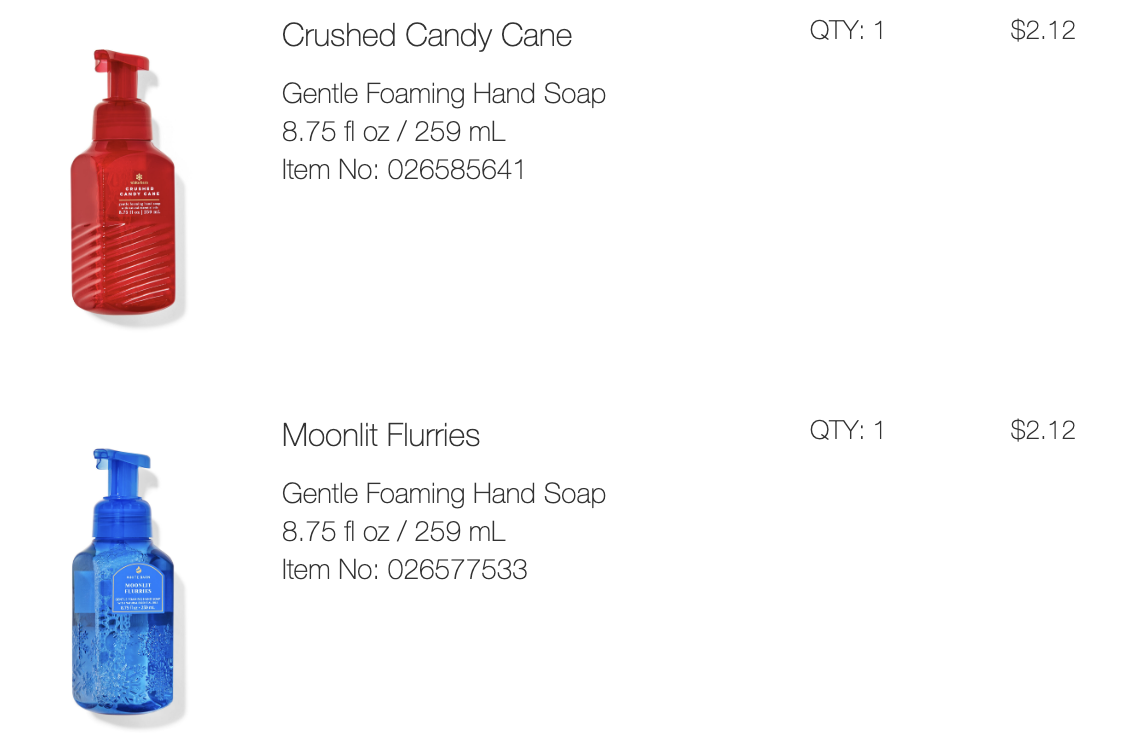다음은 역시 핸드워시인 문릿 플러리즈(Moonlit Flurries)에요. 이 아이도 보틀이 예뻐서 샀어요. 다양한 크기의 눈꽃들이 모여있는 모습이 귀엽죠. 각각 정가 8.5달러 제품을 세일해서 2달러대에 샀답니다. 세일기간을 제외하면 핸드워시 프로모션 가격이 가장 좋을 때가 3+3(3개 사면 3개 무료)정도 인데요, 같은 가격 제품을 구매한다고 가정했을 때 50% 할인이 되는 셈이죠. 핸드워시는 워낙 배바웍 인기품목이라 75%할인도 잘 안되는 제품이라서요, 이렇게 세일 마지막까지 기다려서 사봤어요. 간혹 1.87달러 정도에 나오는 클리어런스 핸드워시도 있는데요, 보틀에 마음이 안가서 이번엔 안샀습니다.