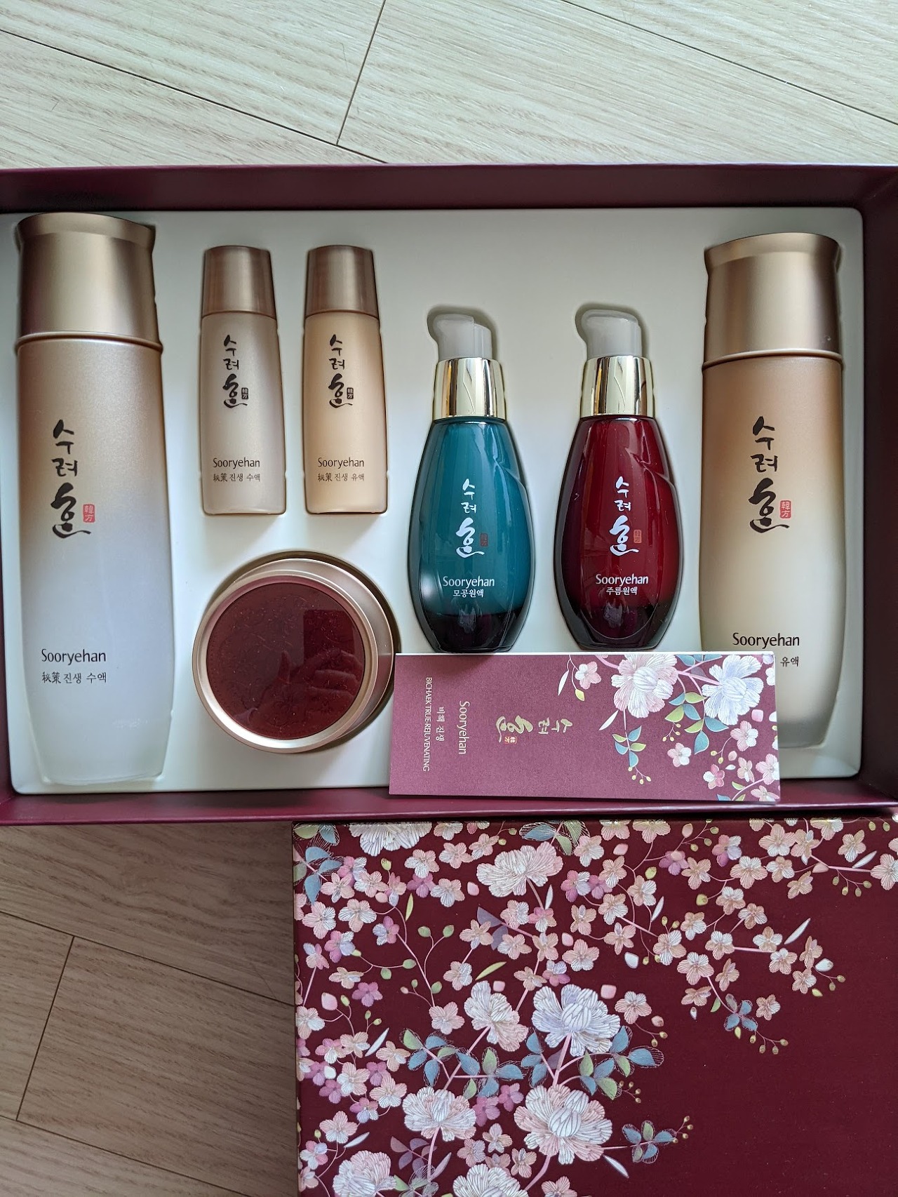 이런 스킨케어 풀세트는 저희 시어머님 드리려고 하나씩 꼭 사오는데요, 스킨케어 제품은 정말 한국이 사용감도 좋고 효과도 최고인것 같아요. 이 퀄리티의 스킨케어 제품을 미국에서 갖춰 사려면 두세배 가격은 하겠네요. 상자도 한국스러운 멋을 잘 살려놓아서 선물하는 맛이 나죠. 고급스러운 선물 찾으신다면 강력 추천드립니다.