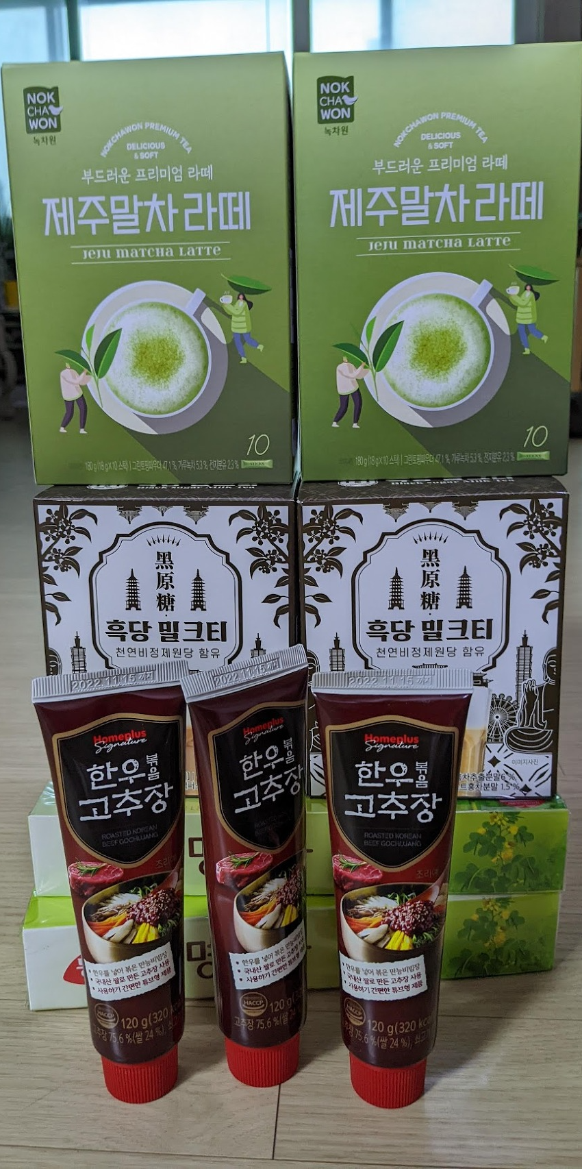 위에서 말씀드린 것처럼 사실 지인분이 어디 사시느냐에 따라 좀 갈리긴 해요. 한인마트에서 가까이 사시고 자주 가신다면 기본적인 라면, 고추장, 된장, 간장, 쌈장 등은 쉽게 구매하실 수 있을 것 같은데요, 저도 한인마트가 멀지는 않지만 그럼에도 불구하고 한국에 가면 꼭 먹을 것들을 이래저래 사오게 됩니다. 일단 여기 요즘 물가가 정말 어마무시하게 비싸기도 하고요, 한인마트라고 하더라도 좀 대중적인 브랜드라던가 품목 위주로 취급하다 보니 특정 브랜드나 품목을 찾기가 어려운 경우도 많아요. 참고로 고추가루는 미국에서 한국산 찾기가 어렵더라고요. 저는 한국에서 한국산 사와서 쓰고 있어요. 맛이 정말 전혀 다릅니다. 말차라떼, 밀크티, 믹스커피 등은 여기서 좀 비싼 편(한국의 두배가격)이라 저는 그냥 사옵니다. 사진엔 없는데 저는 16곡 율무차 이런 것도 엄청 사왔어요. 이런 맛의 음료는 미국 카페에서 찾기도 어렵고 한인마트는 비싸서요. 투썸플레이스 밀크티 가루도 향이 풍부하고 좋더라고요. 종류도 한국에서 고르는게 더 선택의 폭이 넓기도 하고요. 결명자차는 워낙 가볍고 부피도 적어서 그냥 사왔네요. 볶음 고추장도 엄청 사오는데 요즘엔 이것도 한인마트에서 팔긴 하더라고요.