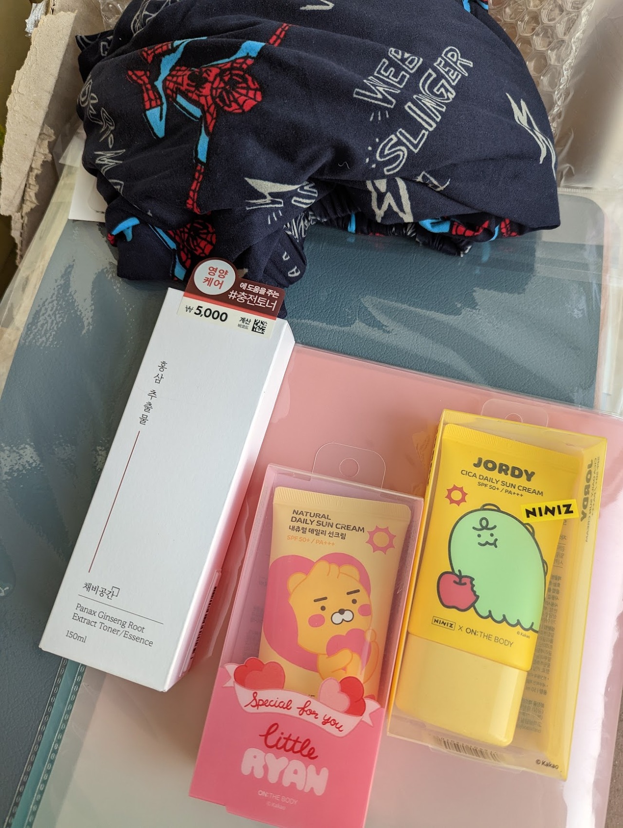 저는 심지어 선크림도 한국에서 사와서 써요. 엘지 온더바디 X 카카오 협업 제품은 너무 귀엽기도 하고 믿음이 가는 품질이라 기쁘게 사왔네요. 여기 제품은 성분도 사용감도 둘다 좋은 제품 찾기가 어려우니까요. 홍삼추출물 같은 한방 스킨케어도 혹해서 한번씩 삽니다. 스파이더맨 잠옷바지는 남편주려고 홈플러스에서 사온겁니다. 미국 캐릭터지만 한국 라이센스 제품 품질이 더 좋더라고요.