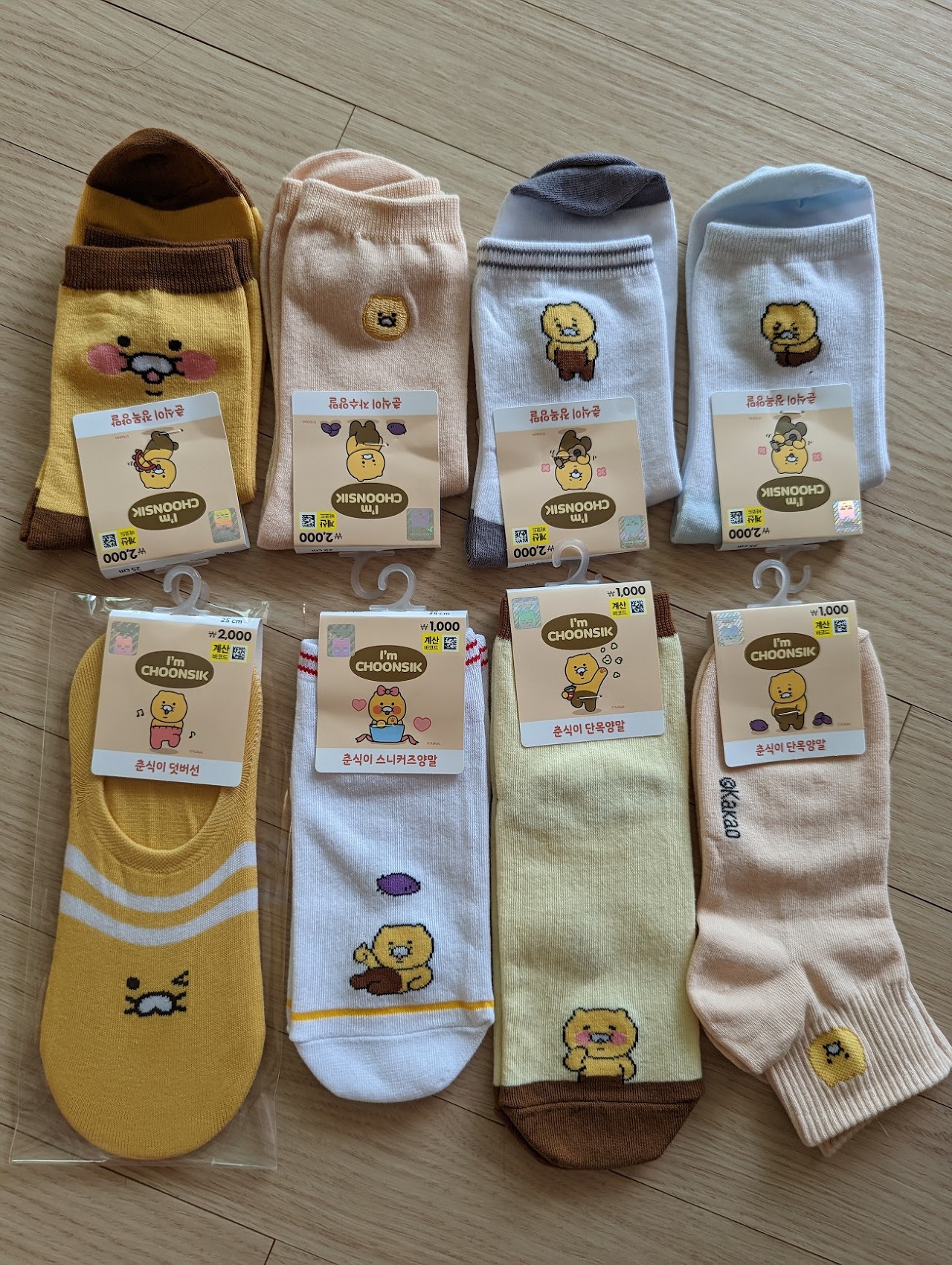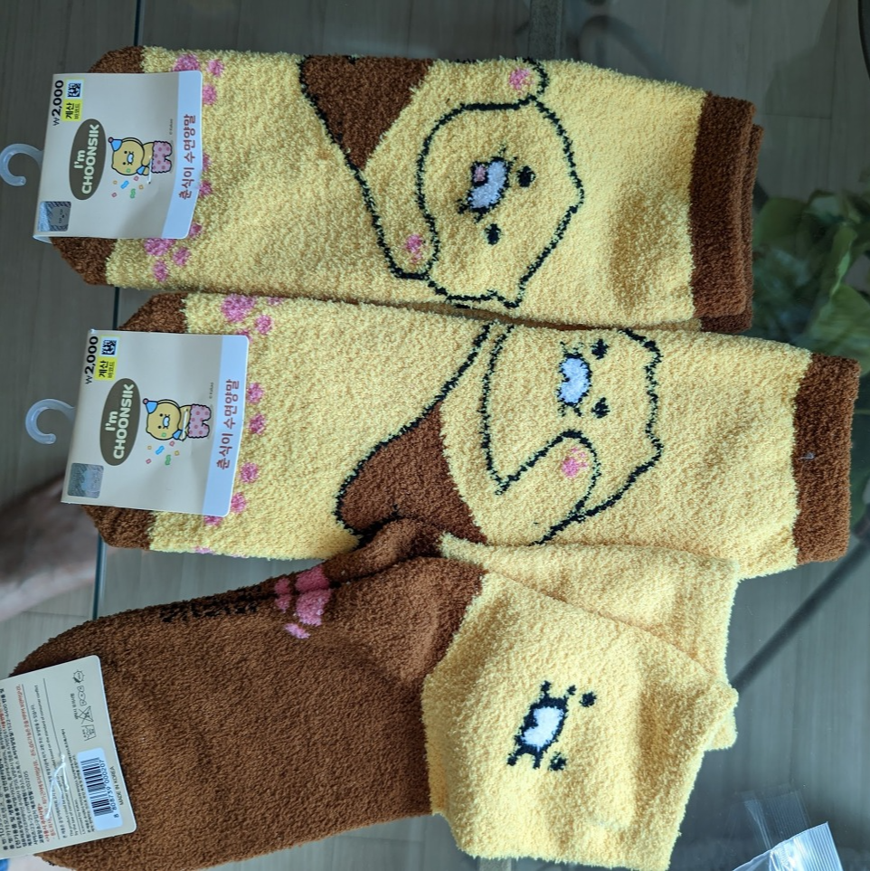 당연히 미국에서는 한국 캐릭터 용품 구하기가 어렵죠. 저는 다이소에서 춘식이 양말 엄청 사왔습니다. 다이소 네 지점을 돌아다니면서 모은 아이들이에요. 이건 아까워서 신지도 못하겠네요.