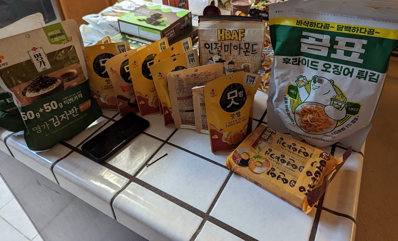 다음은 간식류입니다. 저 곰표 후라이드 오징어 튀김은 정말 맛있고 가벼워서 추천입니다. 저는 여기 한인마트에서 이거 아직 못봤어요. 맛밤이나 인절미 아몬드, 연양갱, 김자반도 여기서 팔긴 하지만 역시 가격이 두배라서 그냥 사왔네요. 한국에 있을 때는 연양갱 잘 안먹는데 미국에서 맨날 짭쪼름한 감자칩이나 버터리한 쿠키만 먹다보면 가끔 이런 할매니얼 팥 간식이 땡기더라고요. 아무래도 미국에는 달고 느끼한 과자가 많아서 한국에 가면 이런 담백한 간식을 사오게 됩니다. 배스킨라빈스 초코나무숲 웨하스는 여기서 안 팔아요. 이베이나 가면 몇배 가격에 팔고 있을지도 모르겠네요. 한때 저희가 꼬북칩에 빠져서 엄청 사온 적이 있는데요, 이런 봉자과자를 깨지지 않게 가져오려면 포장을 엄청 잘하거나 핸드캐리를 해야 해서 좀 난감하더라고요. 다행히 얼마전에 코스트코에 꼬북칩 초코맛이 들어와서요, 신나게 사서 잘 먹고 있답니다.