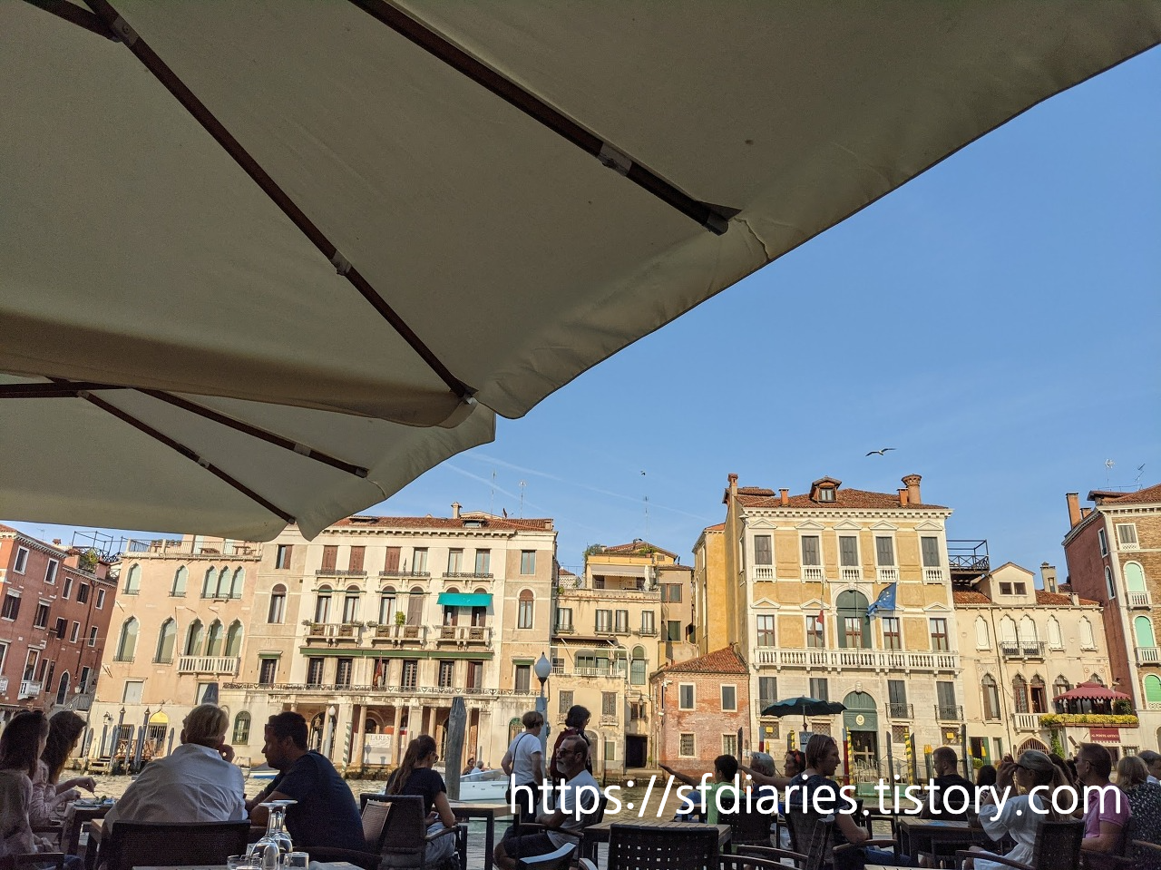 식당에 앉아서 본 풍경입니다. 말 그대로 커다란 운하 카날 그란데가 보이는 최고의 입지에요. 이 식당은 정말 강력하게 추천드립니다. 맛, 뷰, 가격, 와인, 뭐 하나 빠지는 구석이 없는 (제 마음 속의) 베니스 탑 3 맛집이에요. 보시는 것처럼 사람이 바글바글 몰리는 인기 맛집이기 때문에 가기 전에 예약하고 가시는 것을 추천드릴게요. 워낙 인기 맛집이라 서비스는 좀 바쁘고 대충이긴 합니다. 사실 저희 계산서도 1유로 오버차지가 되긴 했어요. 하지만 워낙 바쁜 분위기고 만족스럽게 식사해서 그냥 나왔습니다.