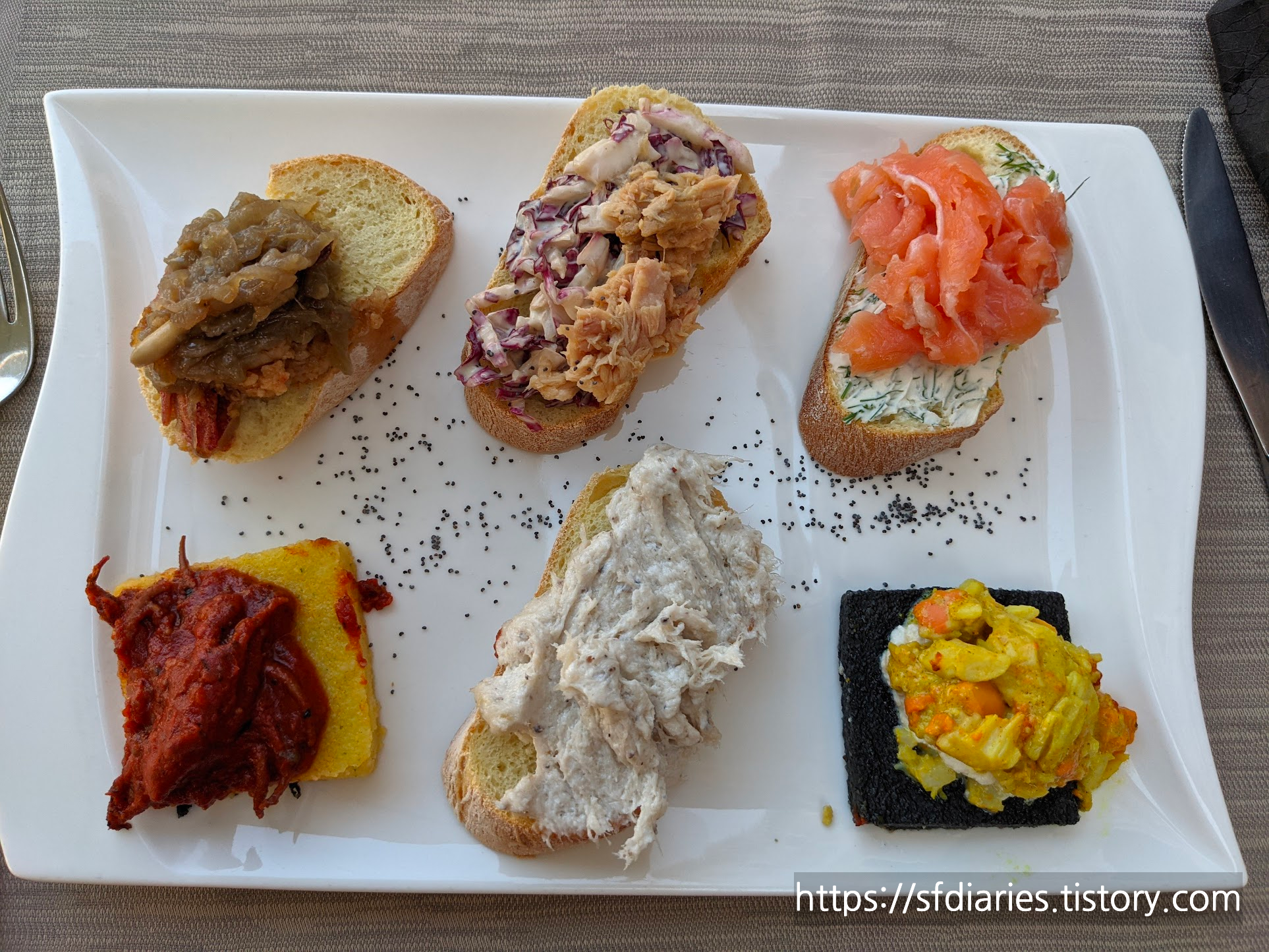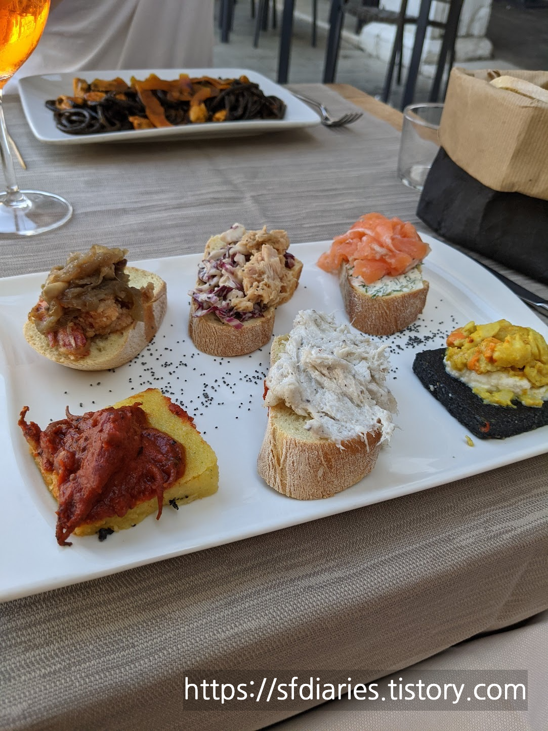 저는 이날 베니스 명물 치케티(cicchetti) 플레이트를 맛보러 갔는데요, 하나하나 단품으로 골랐어요. 오른쪽 상단 연어 치케티와 중앙 하단의 흰살생선 (아마도 대구) 치케티가 저의 최애였어요. 다른 치케티도 맛있었는데요, 다시 간다면 흰살생선 네개, 연어 두개 이렇게 시켜서 먹을 것 같습니다. 치케티는 이런 빵 조각 위에 다양한 토핑을 얹어서 먹는 애피타이저 느낌인데요, 밀라노에서 파스타는 실컷 먹고 간 상태였고 파스타는 사실 이탈리아 어딜가나 있을 것 같아서 베니스에서만 맛볼 수 있는 치케티에 집중해 보고 싶었습니다. 지금 생각해 봐도 후회 없는 선택이었어요.