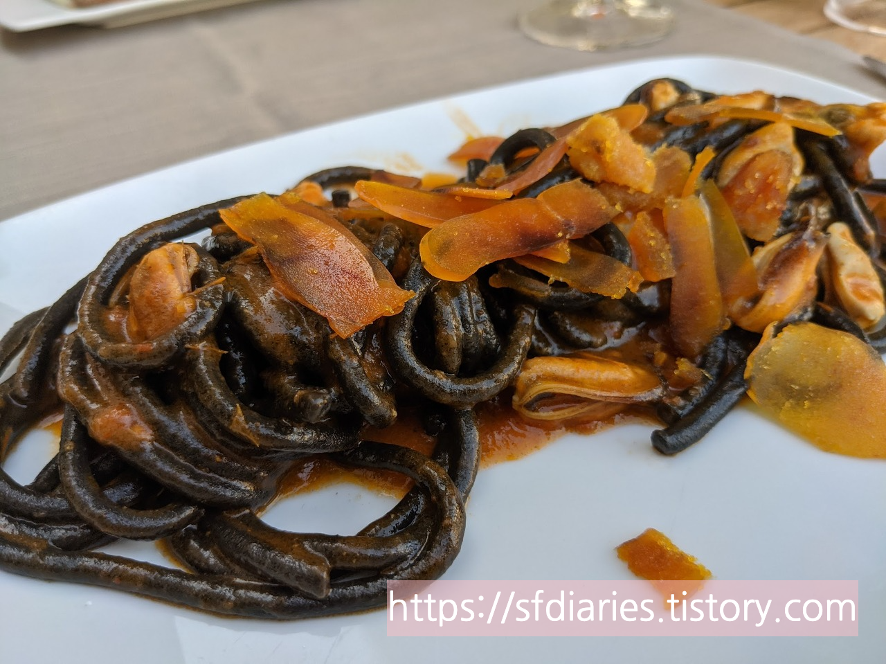 남편은 짭쪼름한 어란과 홍합을 얹은 오징어 먹물 파스타를 주문했어요. 이 아이도 엄청 맛있었습니다. 어란과 굵직한 파스타의 식감이 굉장히 잘 어울렸고 홍합도 굉장히 신선했어요. 사실 굉장히 소량의 식사인데 식후에 젤라또가 먹고 싶어서 굳이 과식하지는 않았습니다. 이탈리아에서는 1일 1+@ 젤라또가 필수죠. 가격은 요리가 20유로대, 와인과 아페롤 스프리츠가 4-5유로 정도 했던 것 같아요. 합쳐서 50유로 정도 나왔어요. 음식 맛과 분위기를 생각하면 하나도 아깝지 않은 가격입니다.