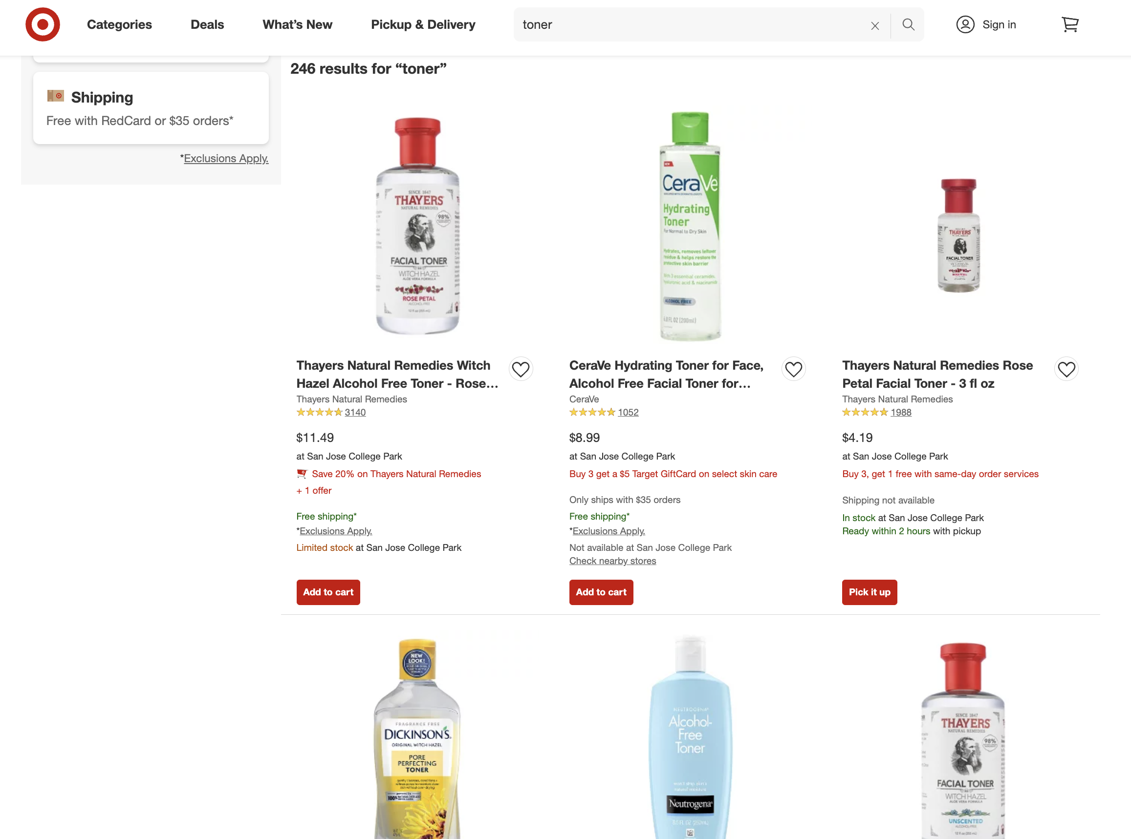 스킨/토너 Facial/face toner: Toner를 찾으시면 주로 닦는 토너가 많이 나와요. 우리나라처럼 밀키한 제형의 보습감 있는 스킨 토너는 잘 없어요. 스킨을 원하시면 차라리 미스트로 보시거나 아예 에센스를 찾으시는 것이 낫습니다.