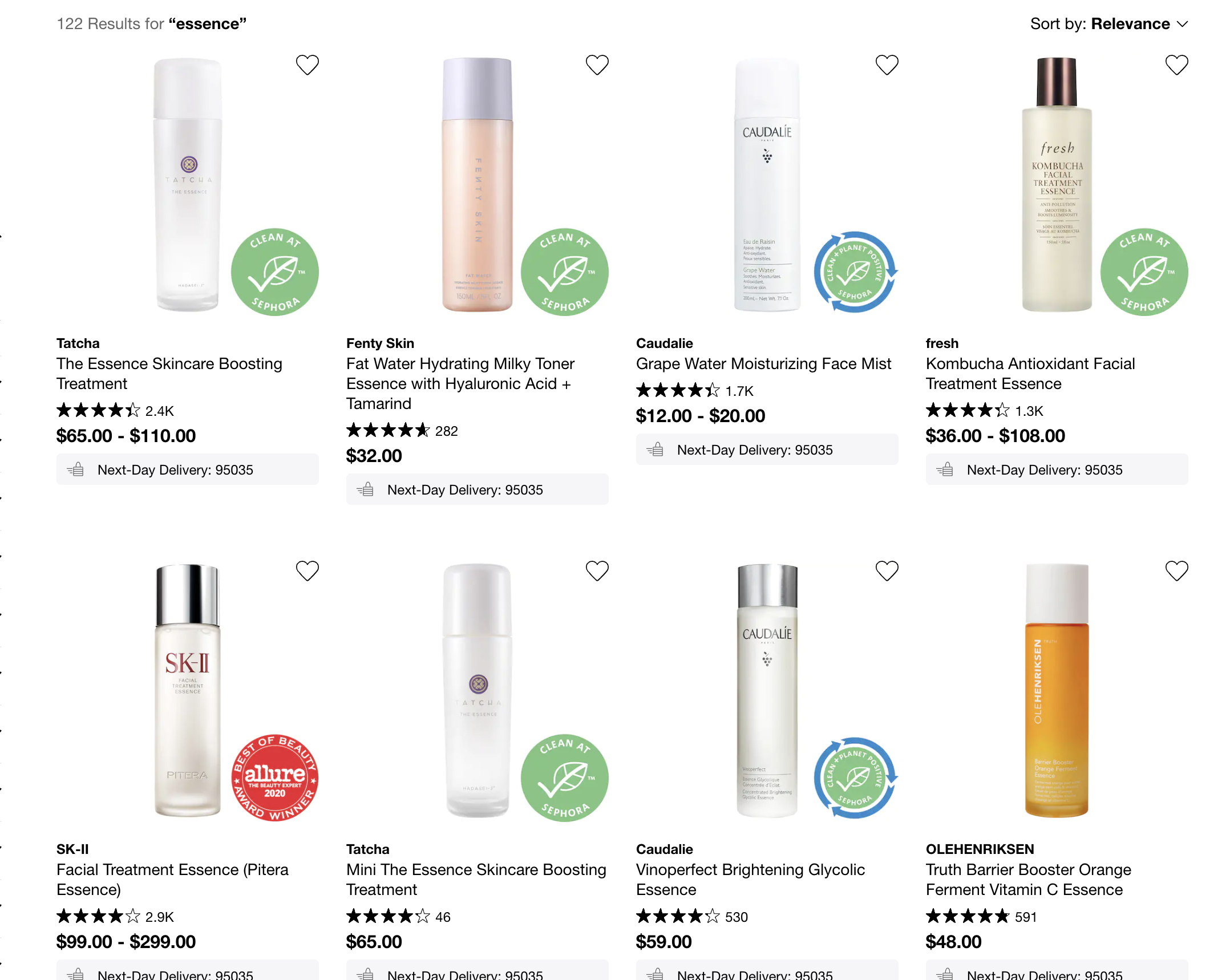 에센스 Facial/face essence, treatment essence, treatment lotion, boosting treatment: 미국에서의 에센스의 역사는 오래되지 않아서 세포라나 백화점 브랜드 위주로 출시되고요, 우리나라 에센스보다 조금 더 토너에 가까운 묽은 제형으로 생각하시는 게 좋아요. 그나마 요즘은 K-뷰티의 인기 덕에 face essence로 검색하시면 한국 브랜드의 에센스는 꽤 많이 찾으실 수 있어요.