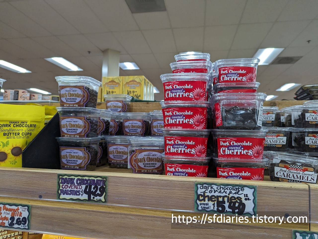 다크초콜렛으로 코팅한 제품이 정말 많죠. 건체리와 건포도 버젼도 보이네요. 건조된 체리는 미국에서도 꽤 비싼편인데 5.49라면 트레이더 조스 답게 가성비가 정말 좋아요.