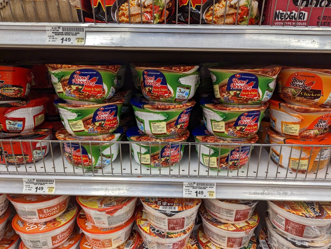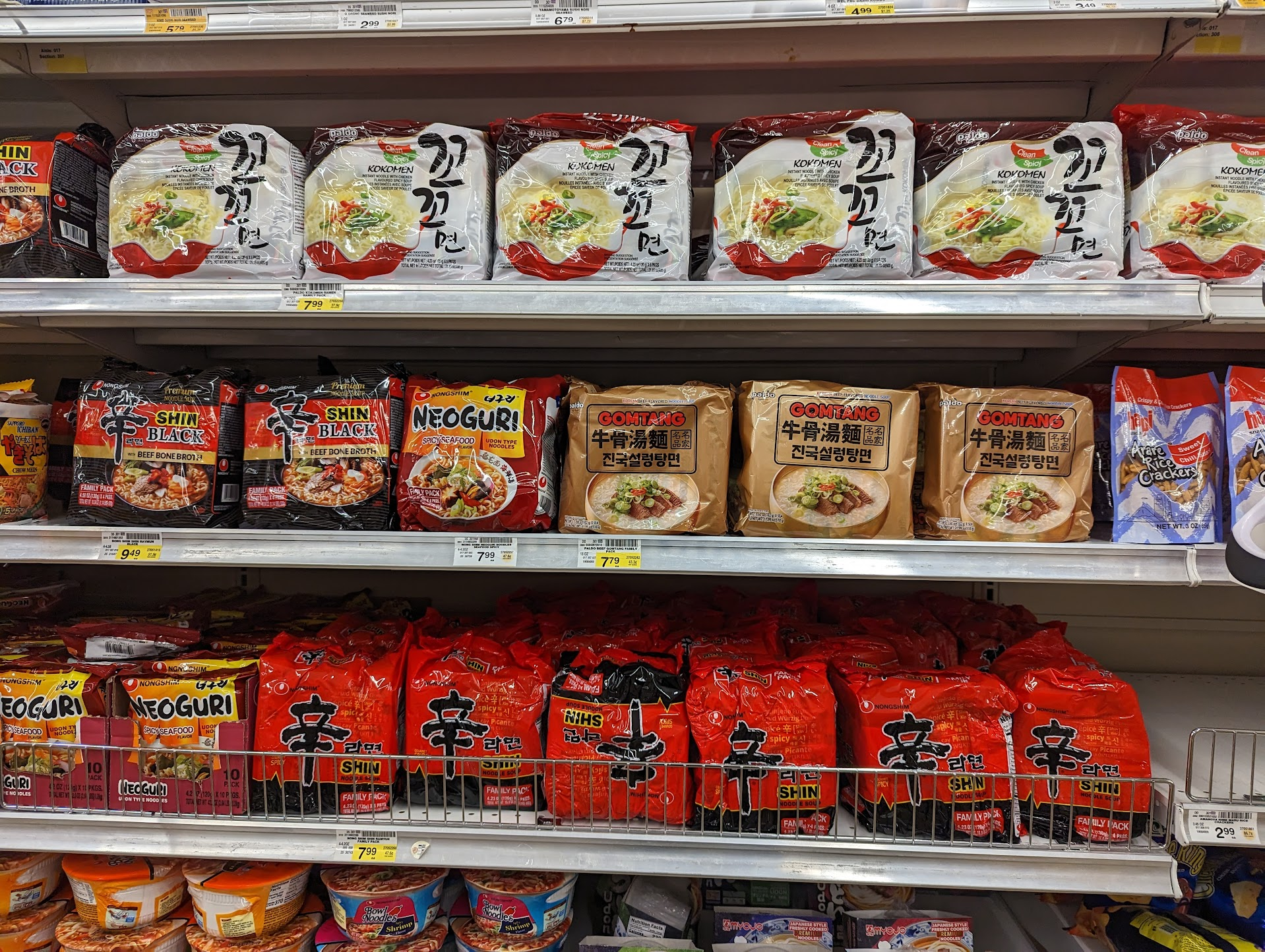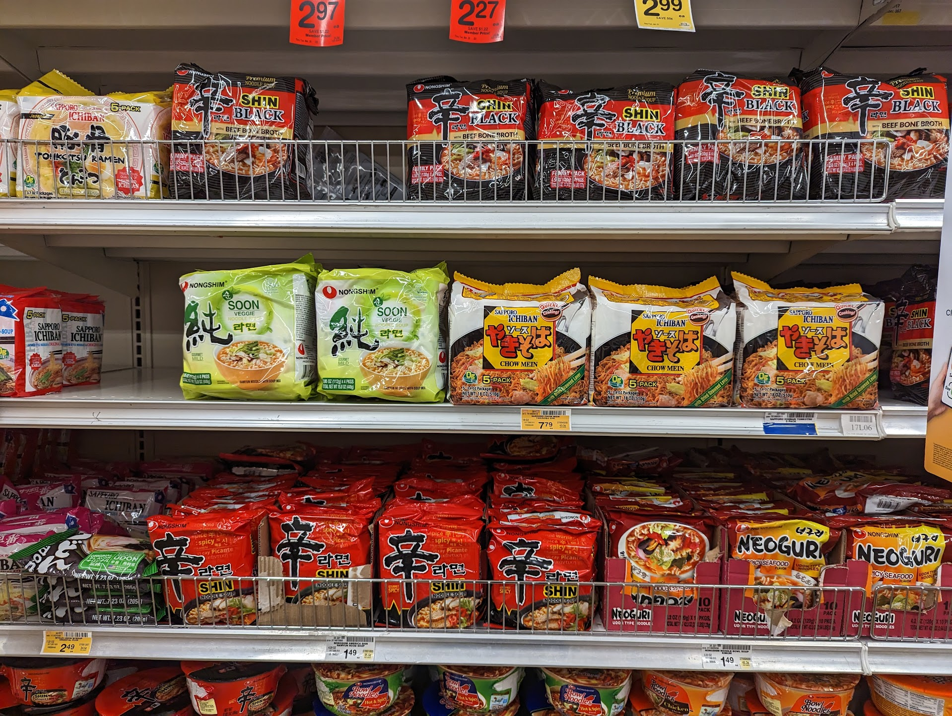 꼬꼬면, 신라면, 너구리, 진국설렁탕면 등 대표적인 몇가지만 있지만 급할 때는 유용하죠. 정가로 치면 가격도 한인마트랑 비슷해요. 한인마트는 세일을 더 자주 해주는 것만 좀 다르고요.