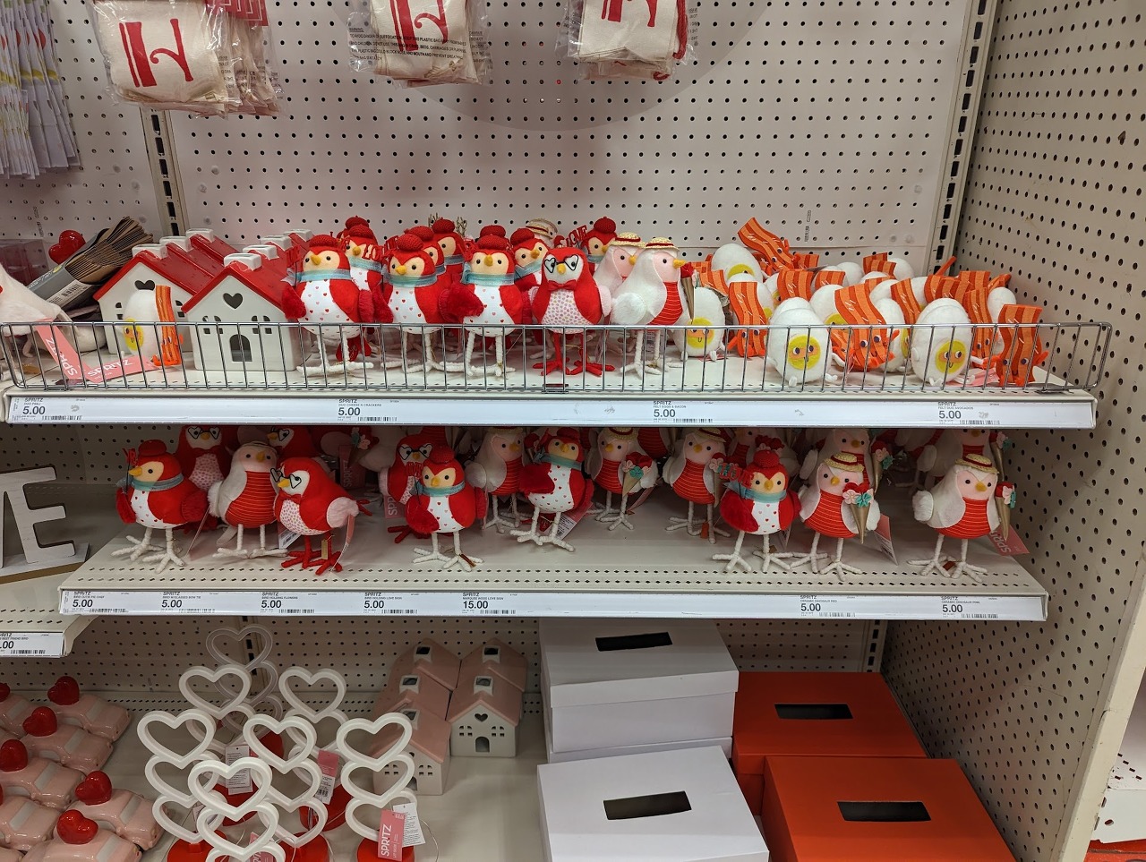통통한 새모양 장식품도 눈에 들어오고요. 미국 사람들은 이런 소소한 인테리어 용품을 참 좋아하는 것 같아요. 타겟이 인기가 많은 이유도 약간 패스트 패션(fast fashion)처럼 저렴하지만 귀여운 소확행 인테리어 용품이 한몫하지 않나, 싶네요. 이렇게 절기별로 자주자주 업데이트 되니까 딱히 살 물건이 없어도 타겟은 참새가 방앗간 가듯 들러보게 됩니다. 이렇게 들어갔다가 식료품도 사고 초콜렛도 사고 인형도 사게 되는 것이죠.