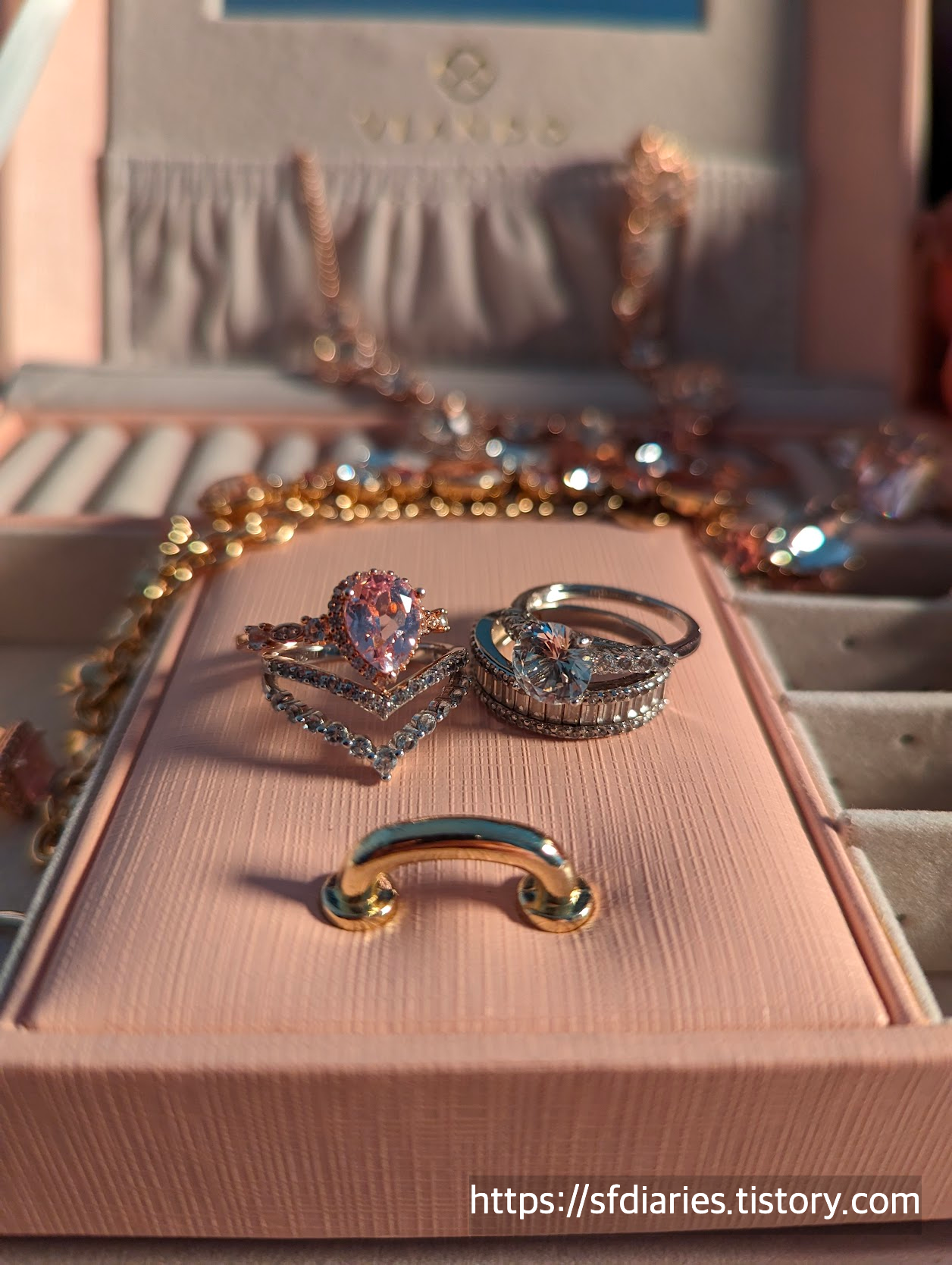 짜잔, 핑크 샴페인 사파이어링과 매치하면 이런 모습이랍니다. 로즈골드와 실버인데도 너무 잘 어울려서 특별한 날에 기분내기 좋아요.