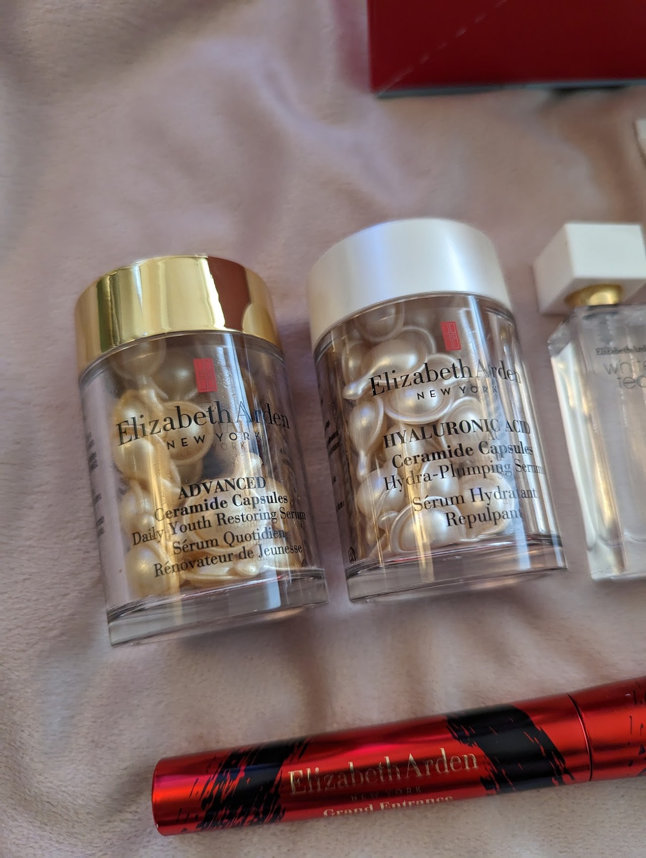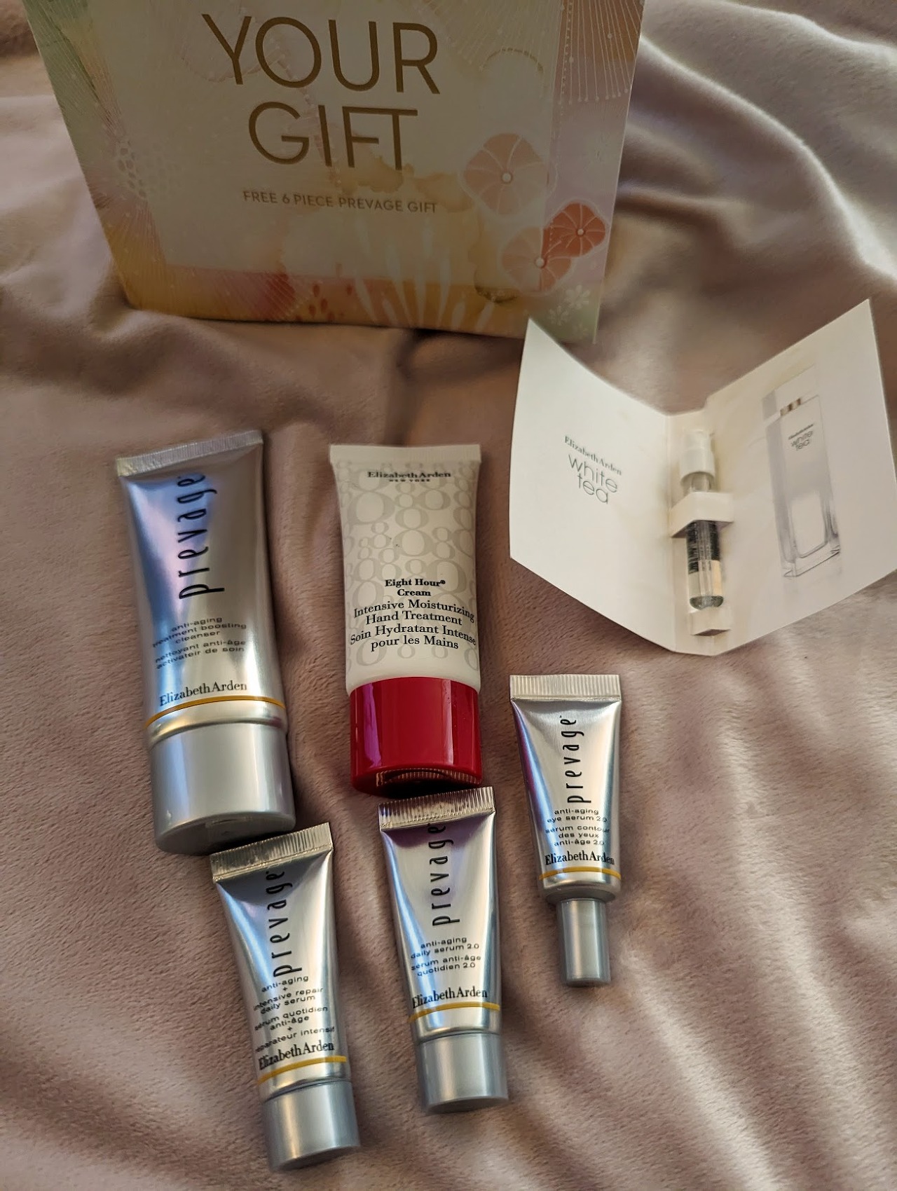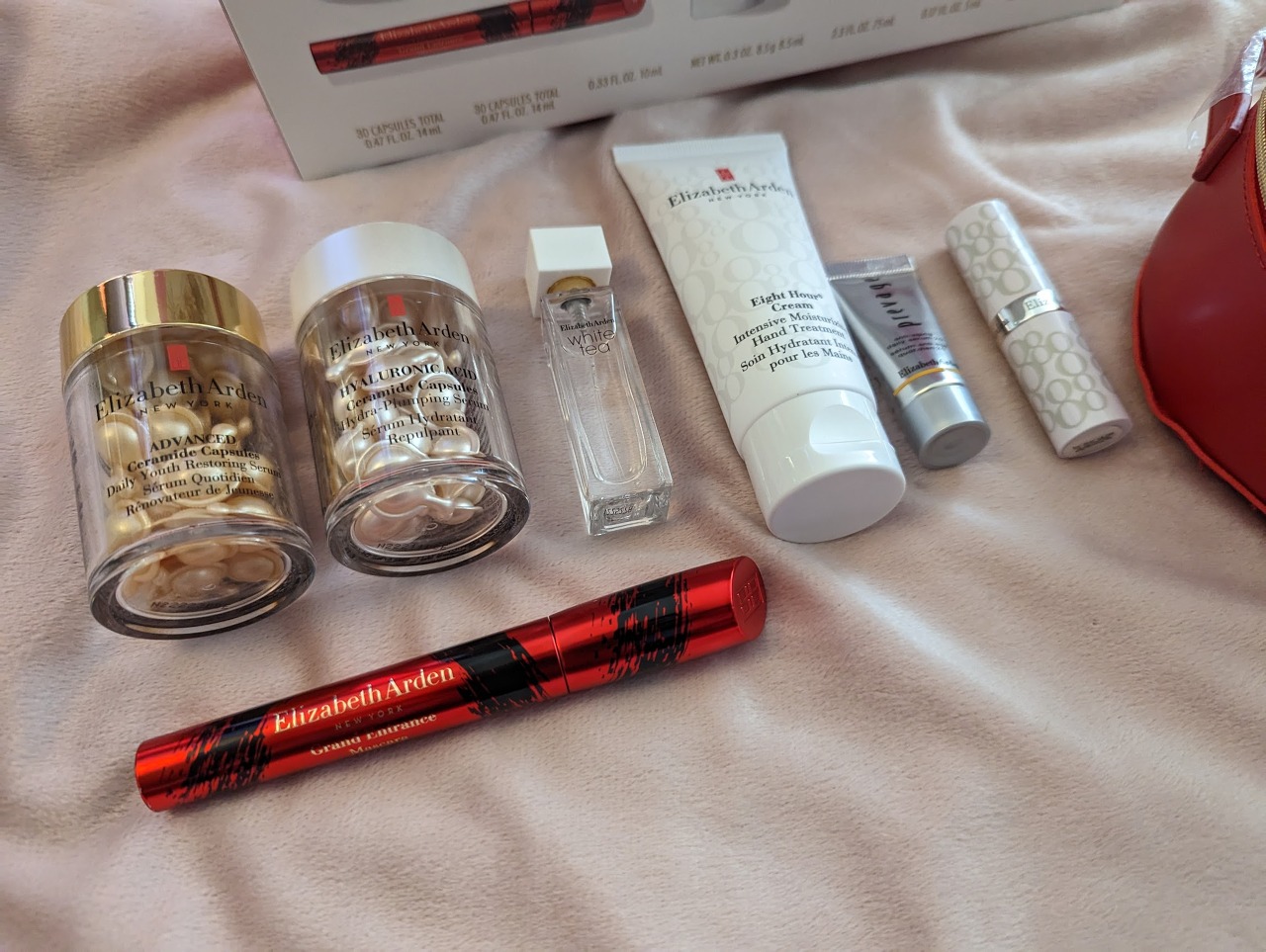 여기에 에잇아워 크림 립 프로텍턴트 선스크린 SPF 본품(정가 27달러), 마스카라 본품 (정가 25달러), 프리베이지 안티에이징 데일리 세럼 샘플, 화이트 티 오드 뚜왈렛 10ml 샘플도 있어서 엘리자베스 아덴의 다양한 베스트셀러들을 한번에 경험해 보실 수 있어요. 마스카라는 좋은 드럭스토어 제품(로레알이나 메이블린)도 미국에 많이 있는데 이렇게 홀리데이 박스로 하나씩 받아버려서 실제로 살 일은 없게 되네요.