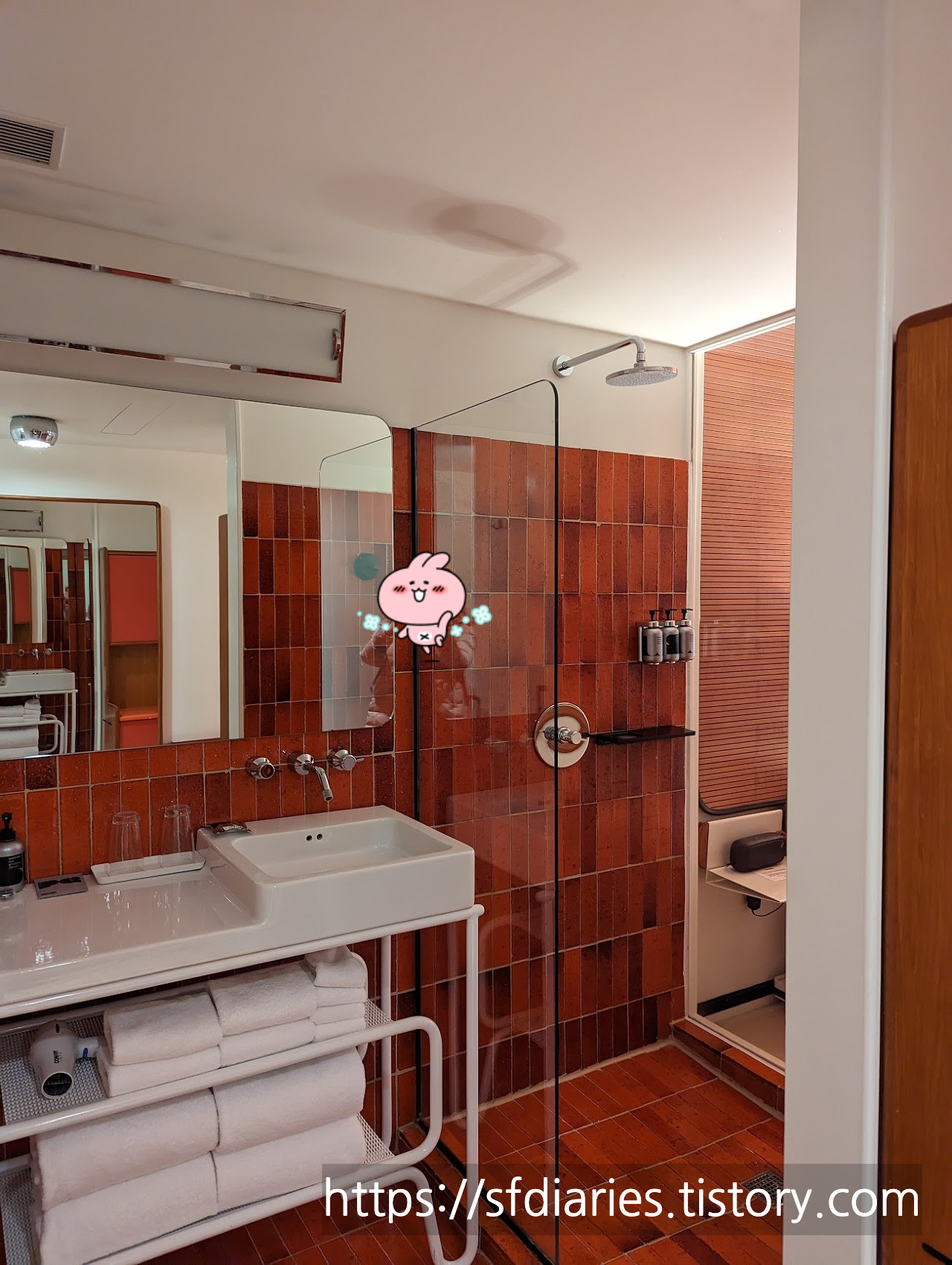 샤워가 유리창으로 완전 오픈된 (!!) 엄청 민망한 구조이긴 하니까요, 참고 부탁드려요. 한국인 관광객은 한분도 안 보이시던데 아마 이 이유가 가장 크지 않을까 싶네요. 호텔 엘레베이터나 로비에서 마주치는 얼굴을 보면 전체적으로 아시아계 관광객보다는 유럽이나 미국 현지인들이 많이 오는 분위기였어요.