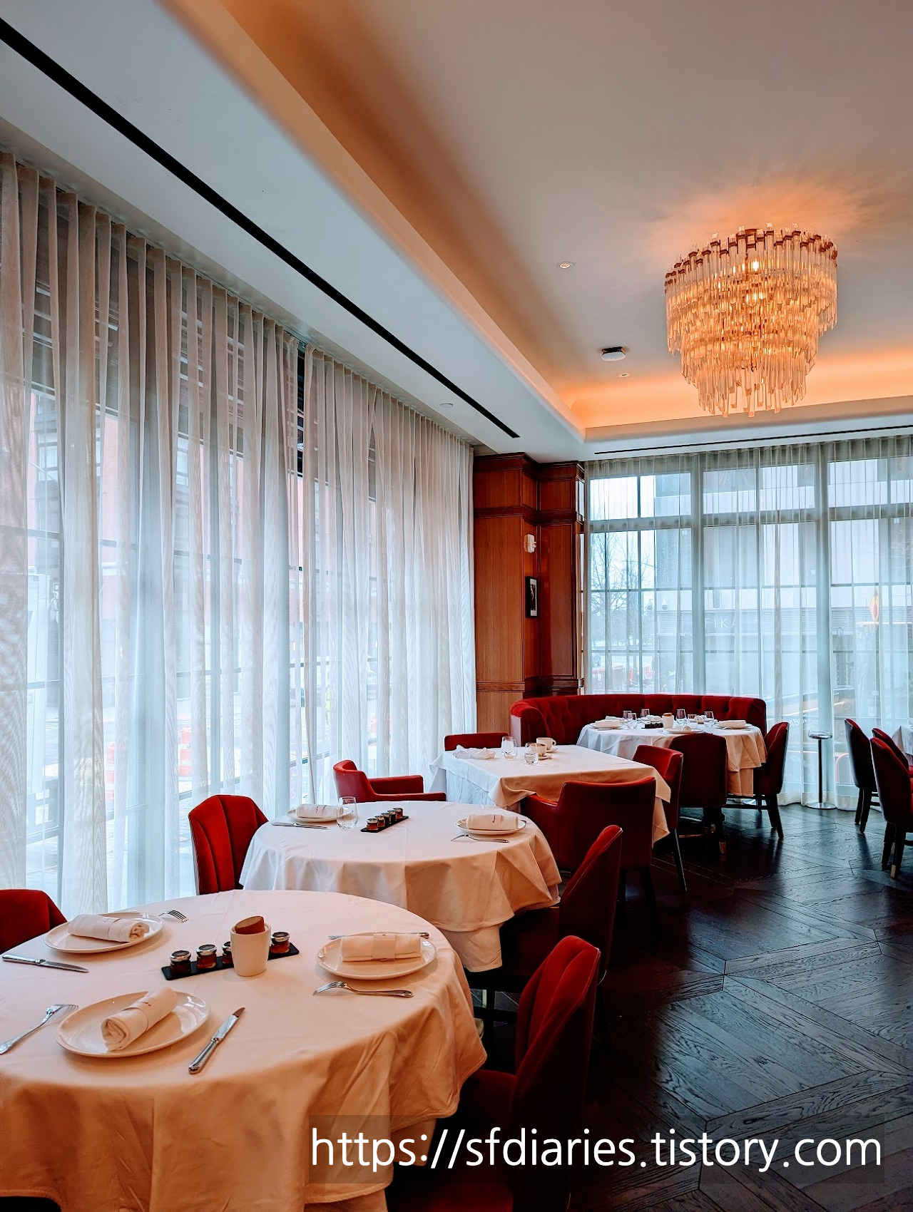 브라세리 테이블 세팅 모습입니다. 세련된 레드컬러의 벨벳 체어가 너무 예쁘고요, 화려한 샹들리에가 더욱 특별한 분위기를 자아내는 것 같아요.