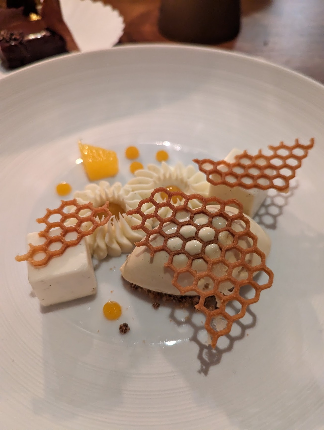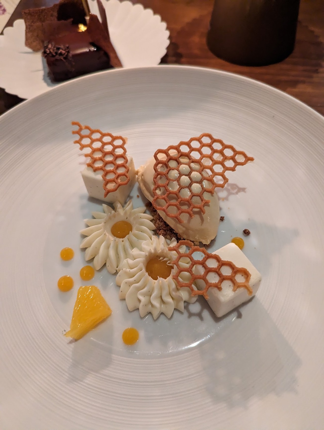 시그니처 디저트인 허니 오렌지 블로썸입니다. 셰프님 이름에 미츠(꿀)라는 글자가 들어가는데요, 그래서인지 꿀맛 아이스크림 위에 벌집모양의 비스킷을 얹은 모습이죠. 아이스크림도 맛있고 마시멜로우도 맛있고 크림도 좋지만 저는 개인적으로 저 벌집모양 비스킷에 감동했답니다. 고급 꿀향이 정말 강하게 베인 맛인데요, 버터를 넉넉하게 사용해서 풍미도 좋고 흔히 맛볼 수 없는, 말 그대로 꿀맛의 비스킷이어서 정말 맛있게 먹고 왔네요.
