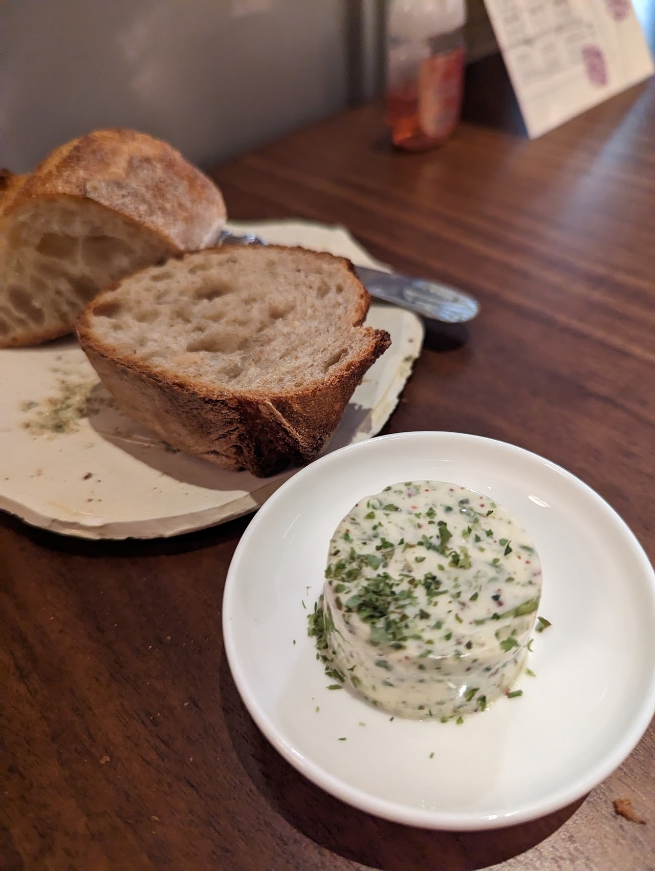 파인 다이닝이라면 고급 버터와 맛좋은 빵도 빼놓을 수 없죠. 바게트와 잡곡빵을 받았는데요, 당연히 리필도 되고 저는 극강의 고소함을 자랑하는 잡곡빵에 더 손이 가더라고요. 버터는 무려 김을 섞은 시위드 버터(seaweed butter)를 제공 받았는데요, 말차가 연상될만큼 시원하고 상큼한 향이 일품이었습니다. 이런 버터는 저도 처음이라 맛을 설명드리기가 어렵지만 정말 맛있었어요.