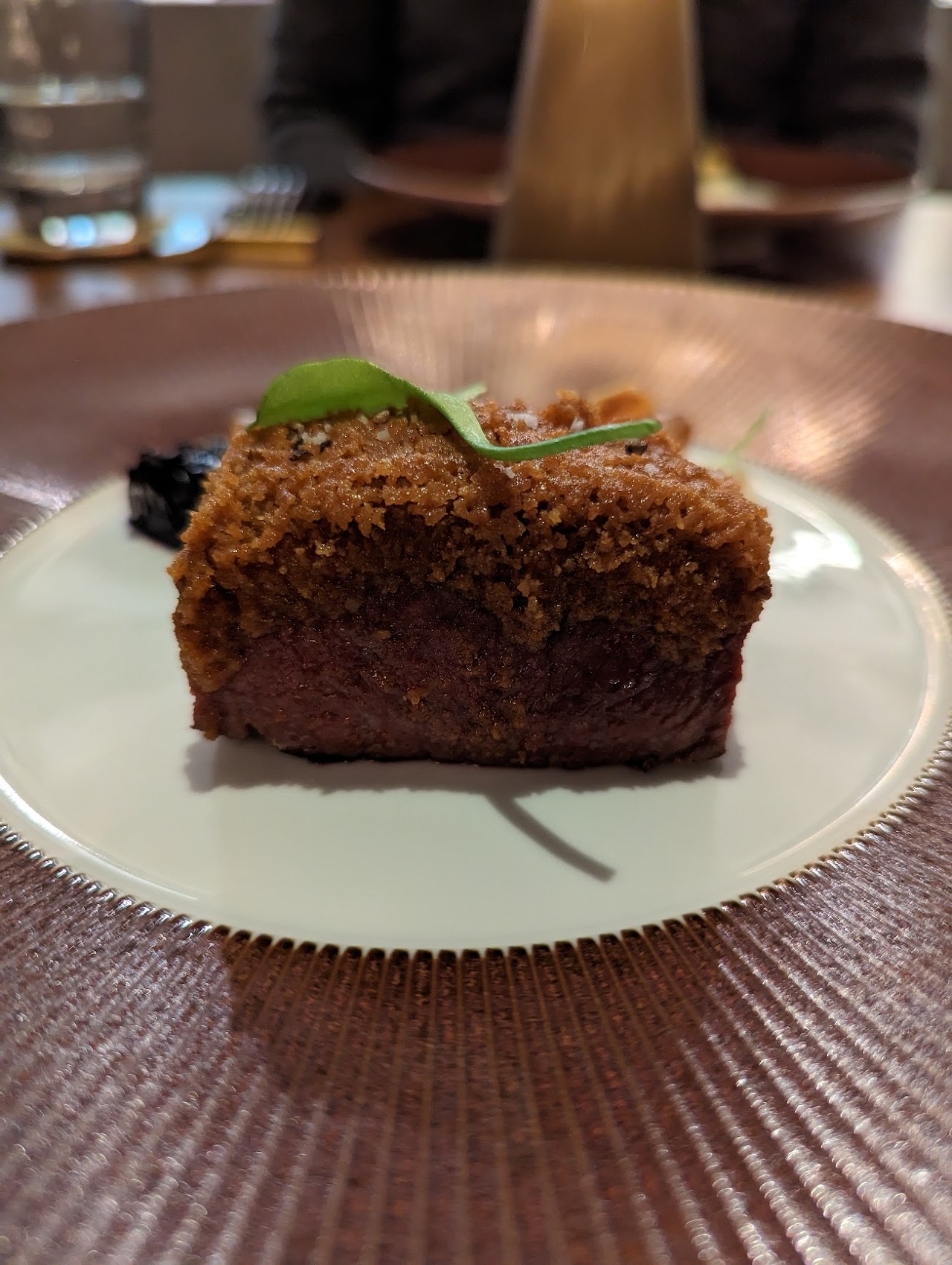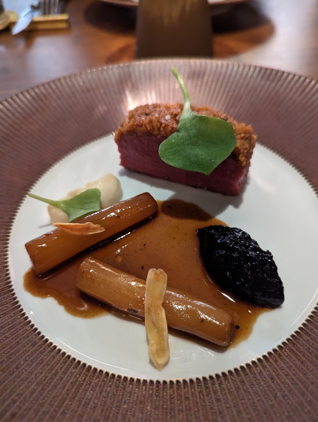 대망의 메인 고기요리입니다. 서플리먼트 요금을 추가하면 A5 와규 스테이크로 업그레이드가 가능하지만 처음 방문해보는 업장이라 굳이 추가해서 먹지는 않았어요. 이 요리는 사슴고기(venison saddle)와 화이트 아스파라거스이고요, 사슴 중에서도 특히 부드럽고 지방함량이 낮은 부위를 사용했다고 해요. 스테이크 위에 있는 크러스트는 버터의 풍미가 상당히 강한, 소보루 빵 윗부분의 최고급 버젼이라고 할 수 있는 토핑이고요, 고기와 패스츄리의 조합이 고든램지 셰프님의 비프 웰링턴을 오마주한게 아닐까 싶은 인상을 주는 요리였어요.