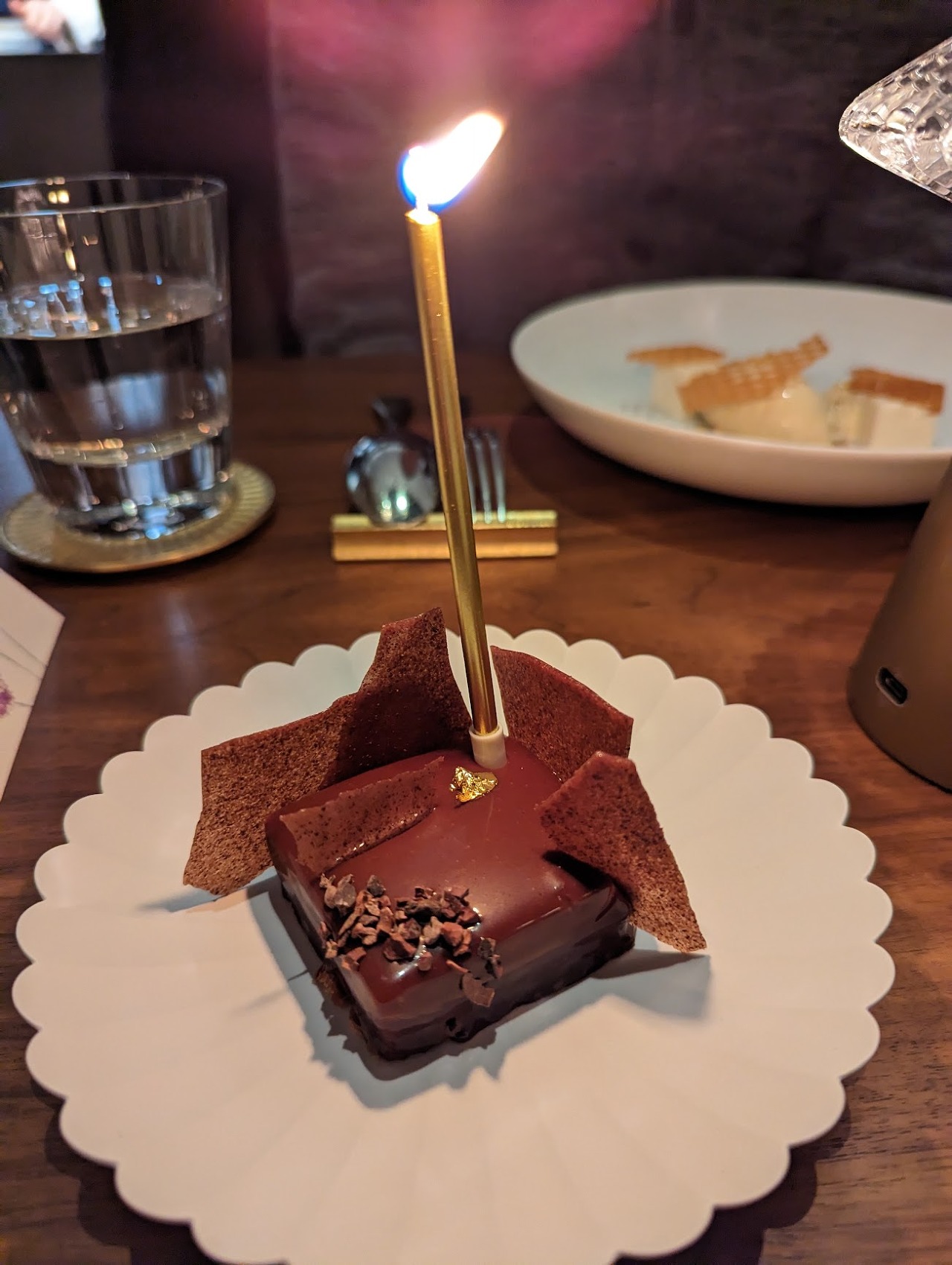 이건 보너스로 생일 케이크를 주셨는데요, 예약할 때 생일이나 결혼 기념일이라고 하시면 이렇게 작은 케이크를 줍니다. 이 아이도 정말 맛있어요. 여긴 진심 디저트 맛집이에요. 초도 엄청 고급스러운 초로 주시고 케이크 역시 역대급으로 꼽을 수 밖에 없는 수준입니다. 초콜렛의 맛도 훌륭하고 식감도 부드러워요. 심지어 초콜렛 가니쉬마저 맛있었어요. 바삭하게 입으로 들어가서 쫀득하게 녹는 매력이 일품입니다.