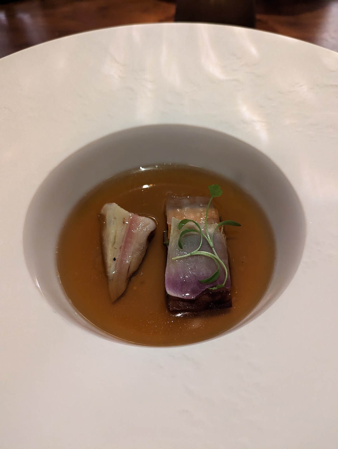 다음은 무려 꿩고기(pheasant) 요리인데요, 일식 다시를 연상시키는 콘소메를 곁들여 줍니다. 콘소메 맛이 좀 많이 진해서 개인적으로 극호는 아니었는데요, 꿩고기가 너무 부드럽고 훌륭하게 조리되어 남편과 감탄하며 먹은 요리입니다. 아마 제가 먹어본 꿩 요리 중 역대급일 것 같아요. 부위가 다른 두 피스를 주시는데 처음에는 이게 생선인가 오해했을 정도로 부드럽고 먹기좋게 만드셨어요. 이 코스에서 세번째로 인상 깊었던 요리입니다.