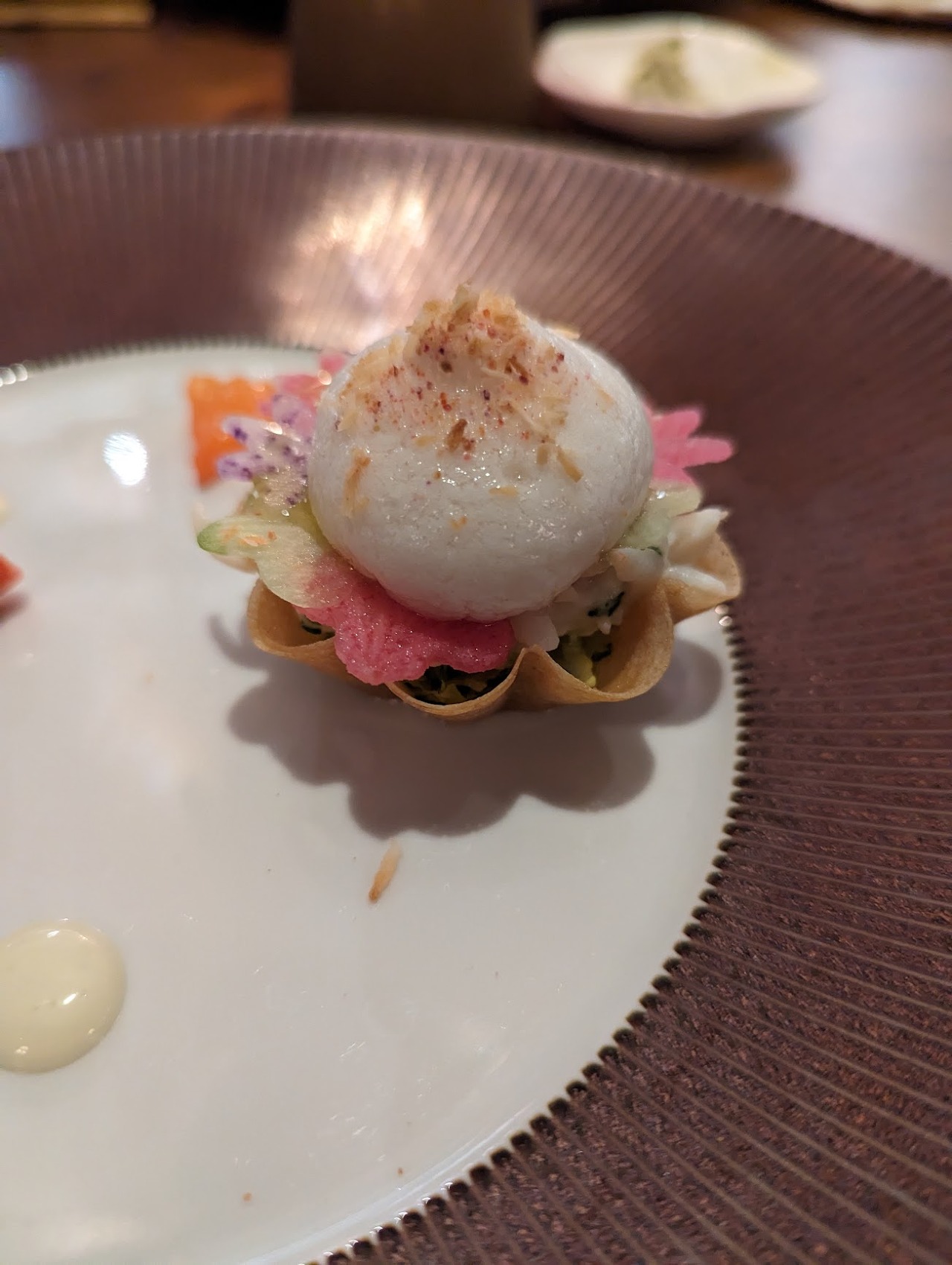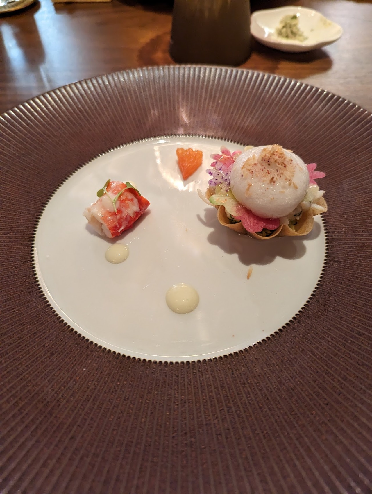 저희는 데구스타시옹(degustation)메뉴를 주문했고요, 2023년 3월 기준 1인당 225달러(+세금과 팁)의 메뉴입니다. 첫 메뉴는 푸아그라 푸딩이었어요. 푸아그라의 맛과 향은 살리면서 느끼함을 빼고 담백한 일식 계란찜 느낌의 식감으로 풀어낸 점이 인상적이었습니다. 위에 가니쉬는 고구마 칩이에요. 우리나라 분들에게는 좀 너무 익숙하지만 미국인들에게는 생소한 식재료겠죠.