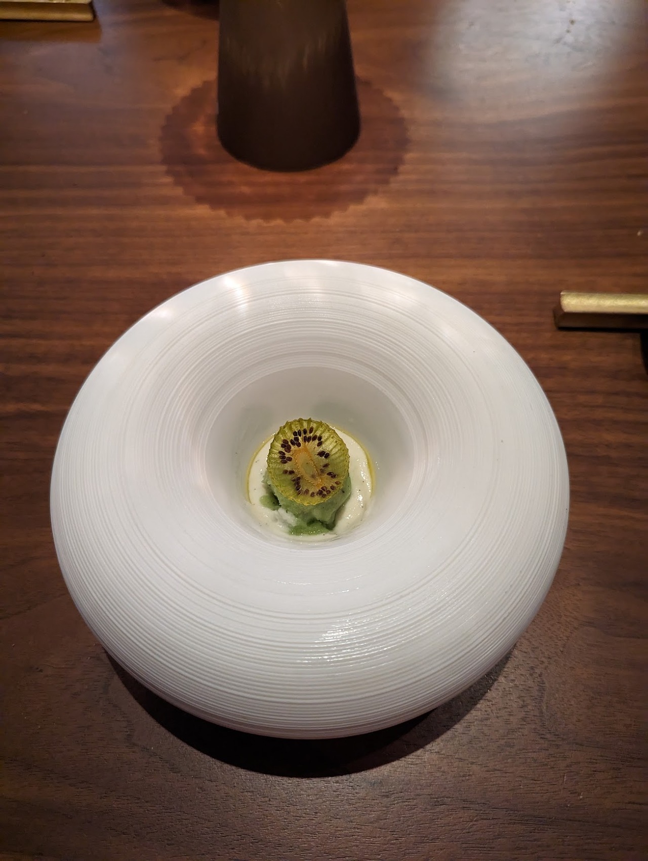 이제 메인 코스는 끝났고 디저트 코스의 시작입니다. 가볍게 입가심용으로 키위 소르베가 나왔어요. 상큼하지만 크리미한 소스를 더해 작지만 특별한 맛을 즐길 수 있었답니다. 말린 키위조각도 바삭하니 맛있더라고요. 정말 식감의 작은 디테일 하나하나까지 신경쓰시는 게 느껴지더라고요.