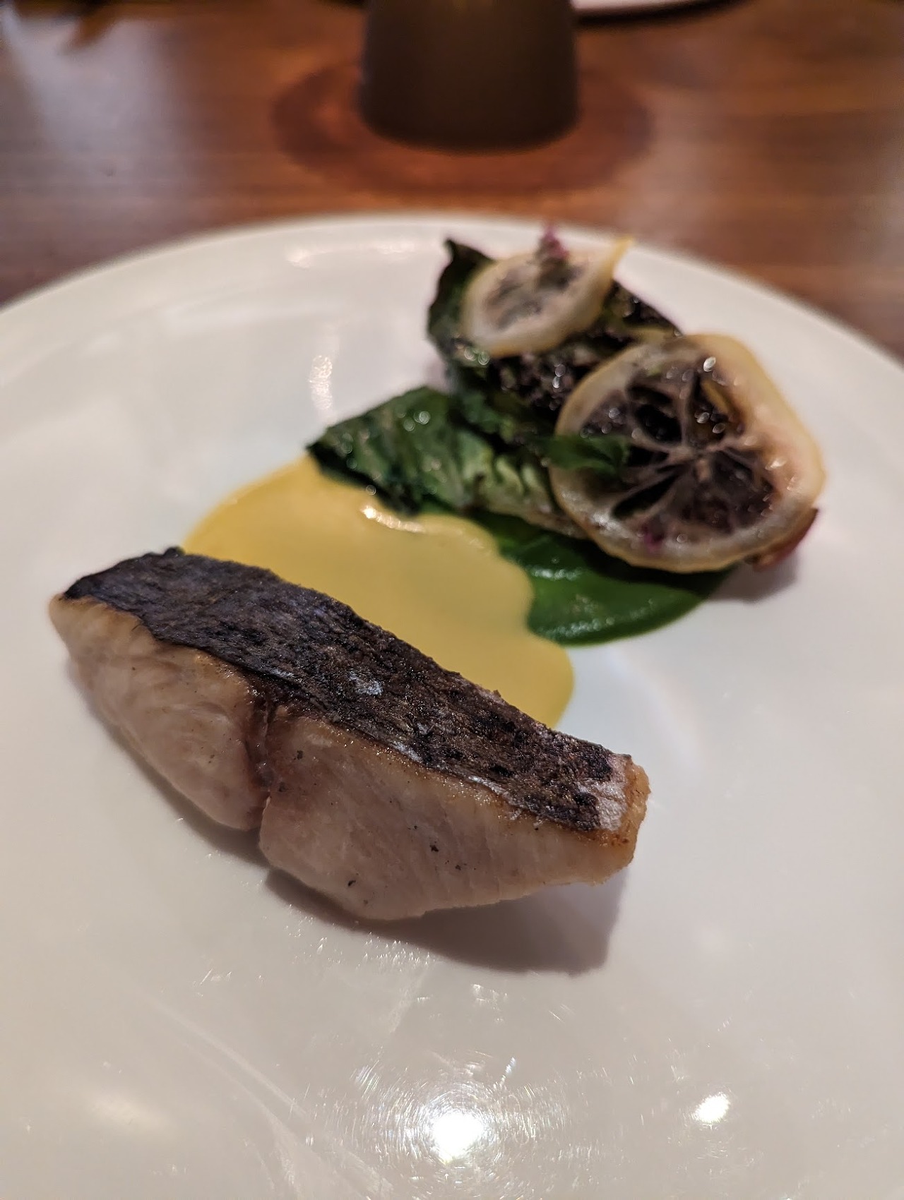 다음은 일본에서 수입해온 고등어(spanish mackerel)와 구운 리틀 젬 양상추(little gem lettuce) 요리인데요, 굳이 일본에서까지 고등어를 왜 수입해왔을까, 라는 생각이 들었지만 아마 미국 현지인들은 이국적이고 특별하다고 느낄 수 있는 부분일 것 같아요. 일본에서 고등어라면 저렴한 백반집에서나 먹던 저에게는 솔직히 파인다이닝에 걸맞는 고급요리로 느껴지지는 않았지만 식감 자체는 매우 훌륭했고요 곁들여 나온 리틀 젬 양상추와 레몬조각 역시 알맞게 구워주셔서 기분좋게 먹을 수 있었어요.