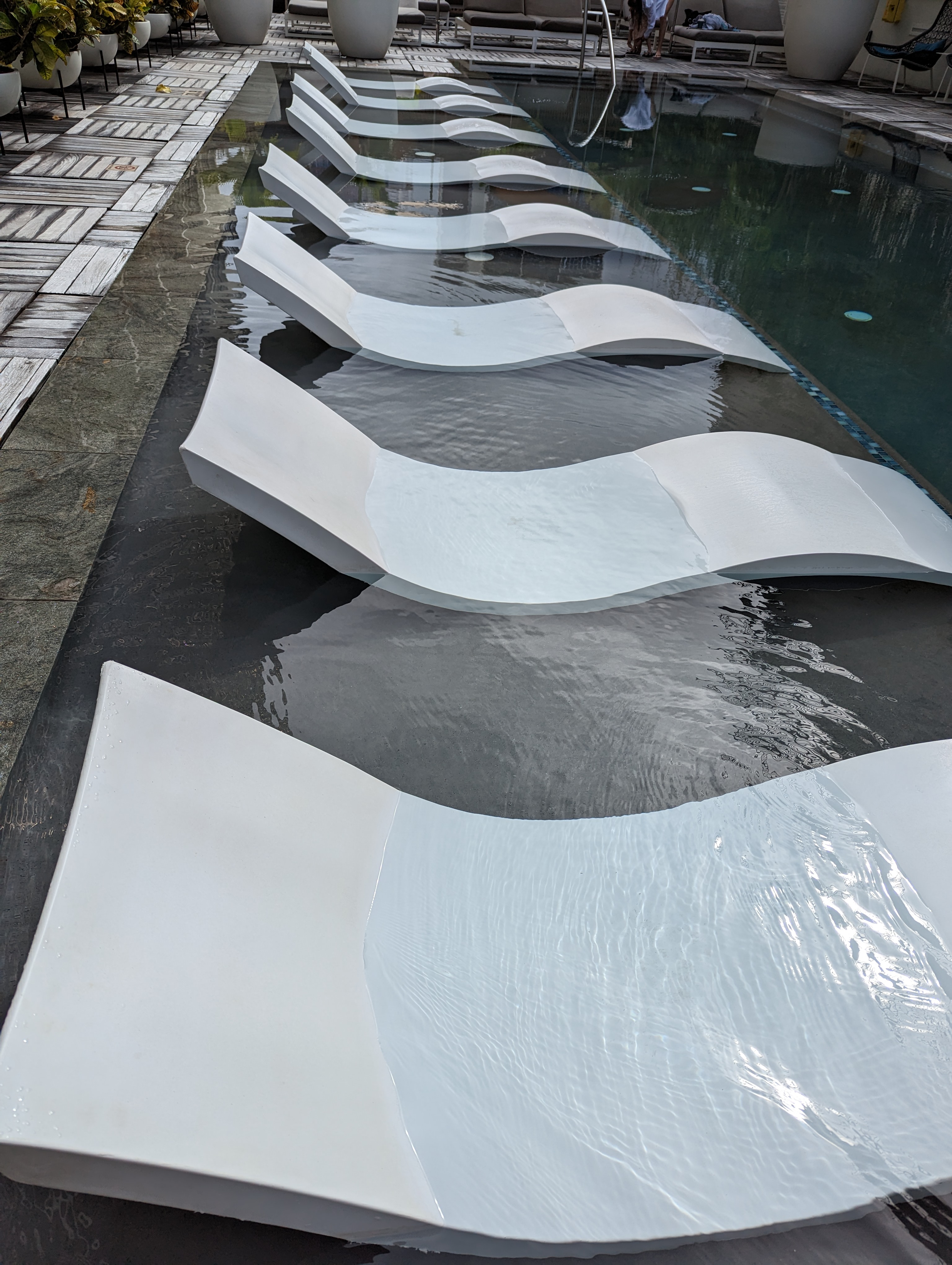 들어가보진 않았지만 소소하게 수영장이 있고요, 물에 몸을 담글 수 있는 센스있는 비치체어도 있답니다. 비치타올은 이름과 방번호를 적은 후 몇장이든 대여가 가능하고 수영장 옆에 레몬워터 및 선글라스 세척티슈, 선크림 등 꼭 필요한 어메니티들이 세심하게 준비되어 있어 더욱 편리했어요. 여기 직원들도 참 친절해서 뭐든 물어보면 적극적으로 잘 도와줍니다.