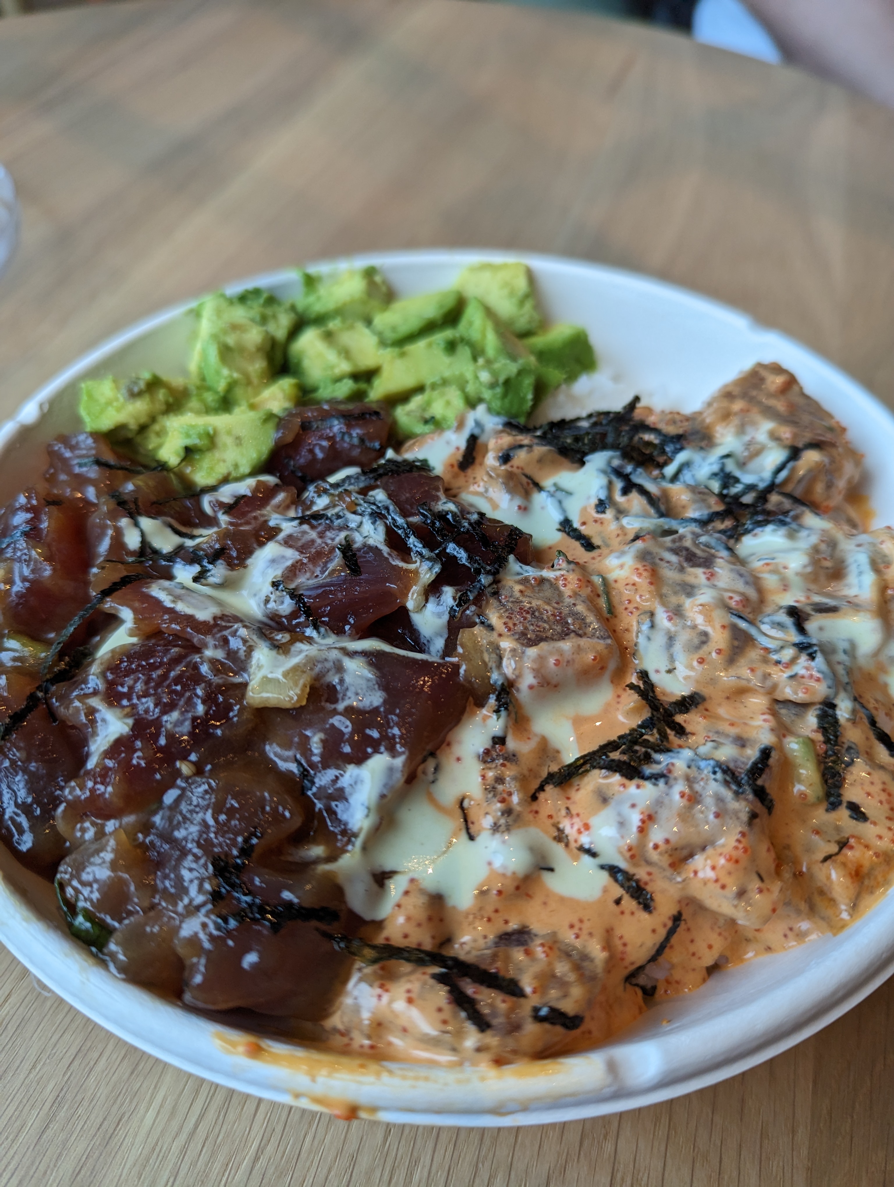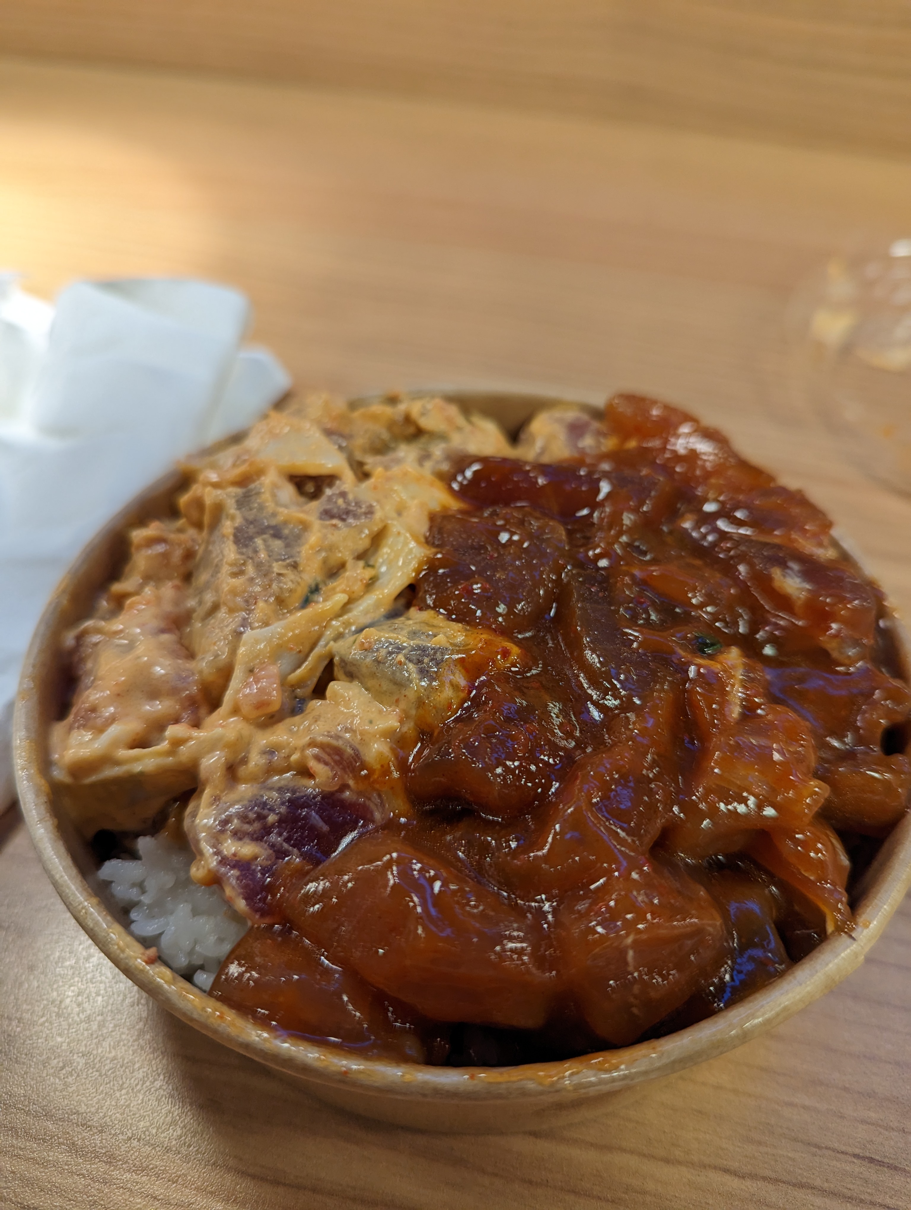 대망의 포케볼입니다. 포케 카운터에 가서 주문을 하고 계산대에서 돈을 내면 되는데요, 어느 맛을 고를까 고민되시면 포케 카운터에서 시식도 가능하세요. 종류가 너무 많아서 제가 망설였더니 점원분이 친절하게 시식용을 이쑤시개에 내어주셔서 오이스터소스맛과 스파이시 반반으로 결정했습니다. 스파이시는 의외로 꽤 많이 매웠고요 (맵찔이 기준), 오이스터 소스는 깊은 감칠맛이 일품이에요.
