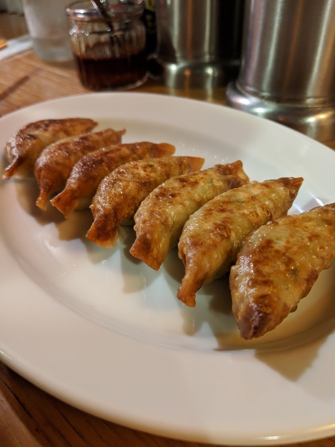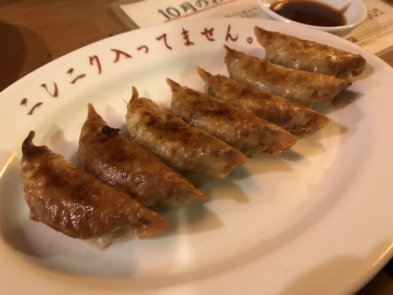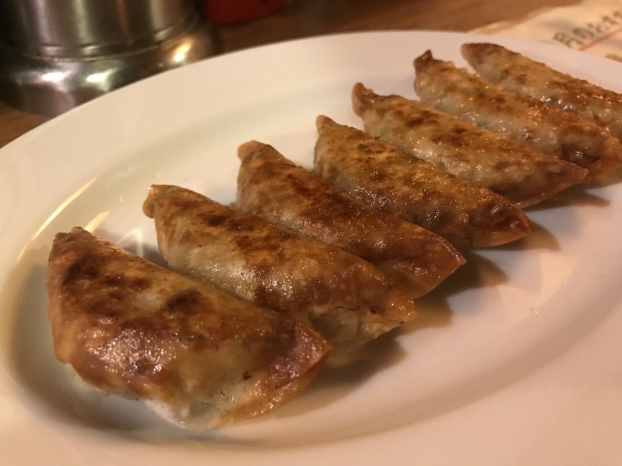 메뉴 구성은 간단합니다. 야끼교자(군만두)와 스이교자(물만두), 그리고 마늘의 유무를 선택하시면 되요. 저희는 야끼교자만 여러번 시켜먹고 나왔습니다. 마늘이 없는 교자도 궁금해서 먹어봤는데요, 물론 마늘이 들어간 교자를 추천드립니다. 일반적인 일본 교자보다 만두피가 얇고, 크루아상이 연상될만큼 피에 기름이 잘 베어있어요. 보시는대로 평균적인 교자보다 크기가 작지만 씹을때마다 육즙이 입안에서 팡팡 터집니다. 육즙을 남김없이 드시려면 조금만 식혀서 한입에 드시는게 좋아요.