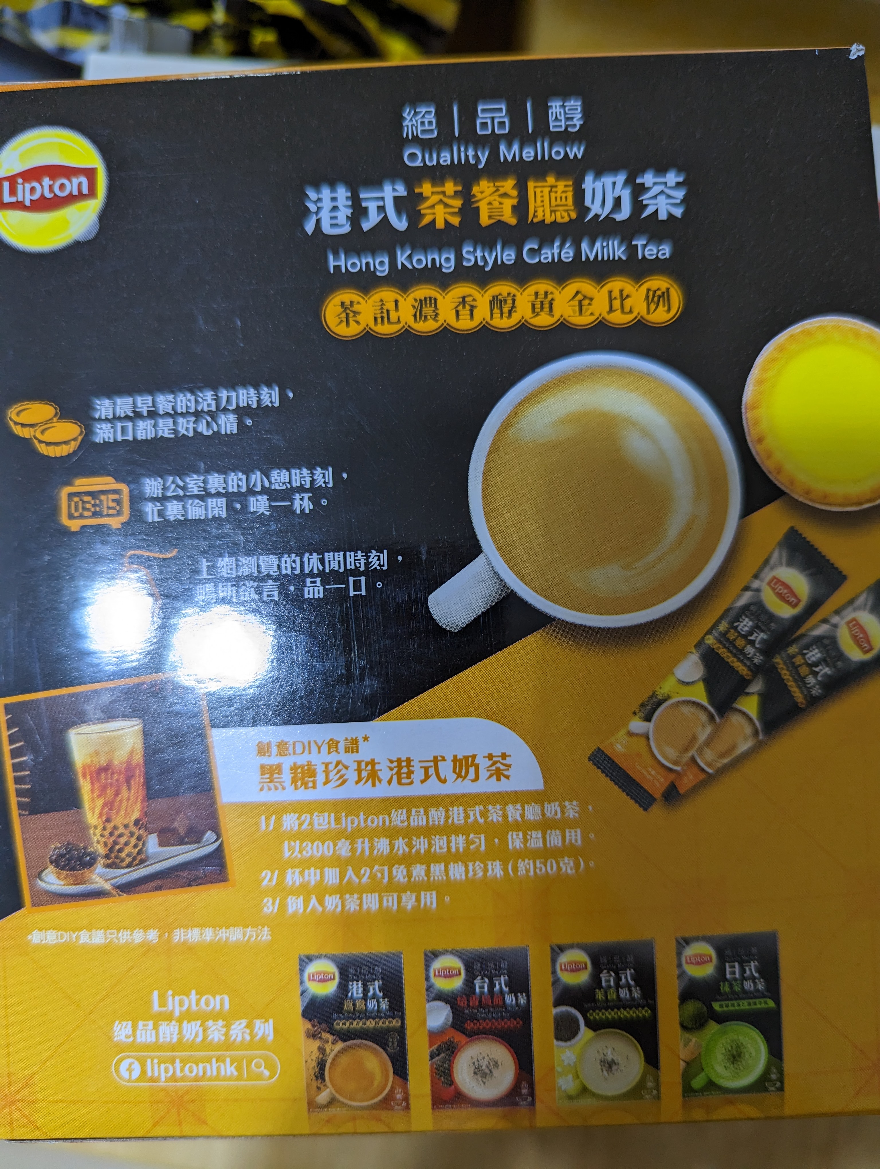 립톤의 Quality Mellow Hong Kong Style Cafe Milk Tea라고 써 있습니다. 찻잎의 향과 연유의 풍미를 정말 정확하게 재현해낸 제품이고요, 솔직히 웬만한 차찬텡의 밀크티와 블라인드 테스팅을 해도 이길만한 아이입니다. 이 시리즈에서 윤양차(커피밀크티)도 사서 마셔봤는데요, 이 아이도 굉장히 훌륭하지만 한국의 커피믹스와 좀 비슷한 맛이어서 윤양차를 정말 좋아하는 분이 아니라면 굳이 추천드리진 않을게요.