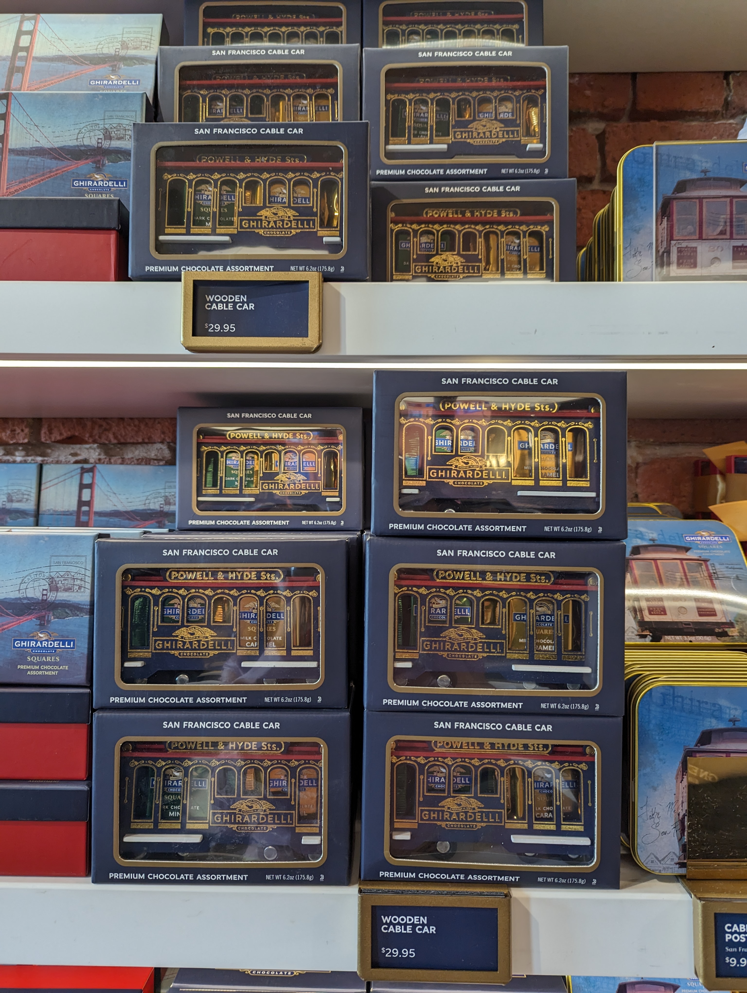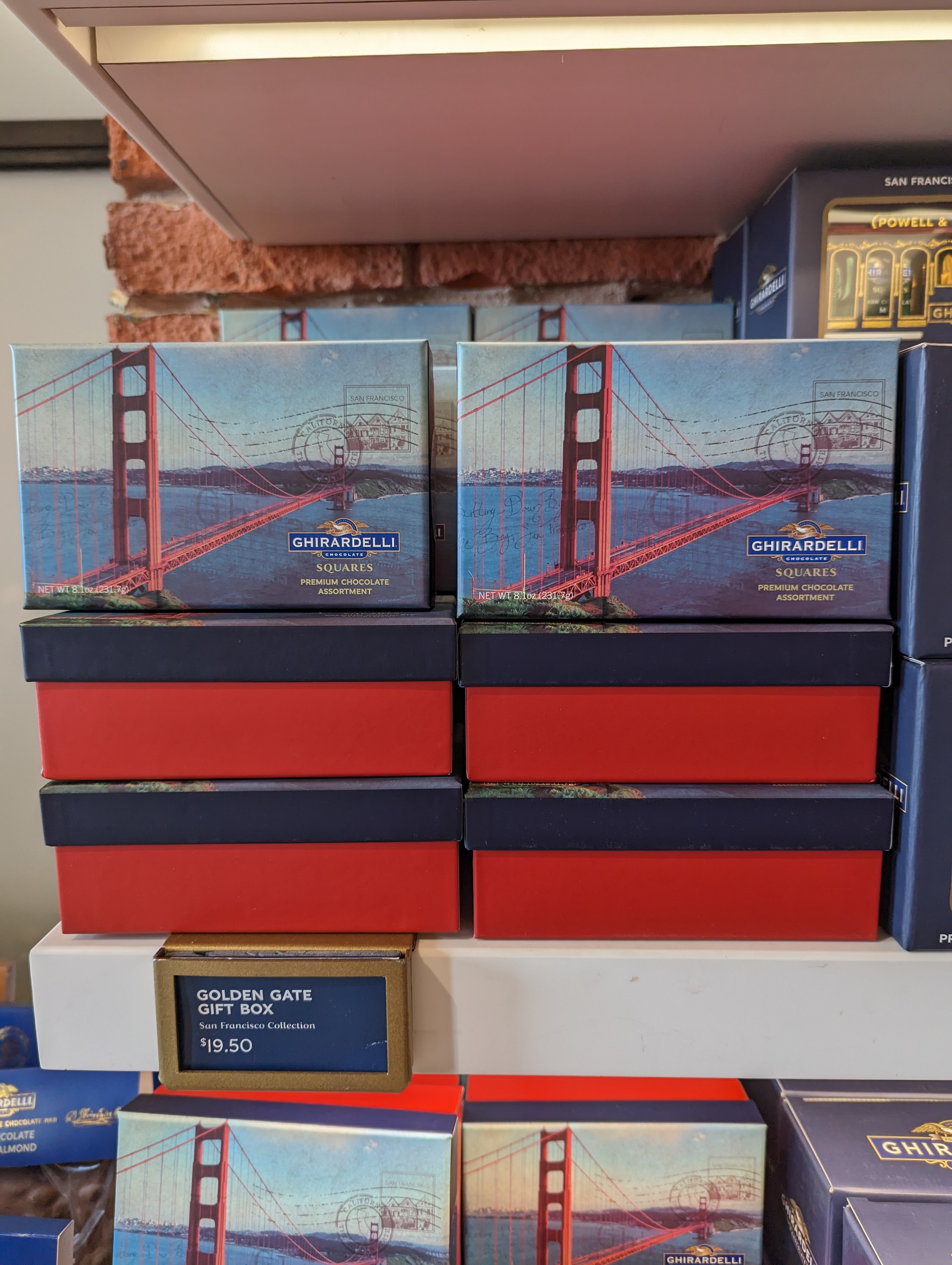 금문교가 그려진 초콜렛상자는 20달러에요. 공항 면세점에 있는지는 잘 모르겠지만 있다고 해도 가격이 여기보다 비쌀 가능성 99퍼센트입니다. 마음에 드시면 여기서 사시는게 나아요.