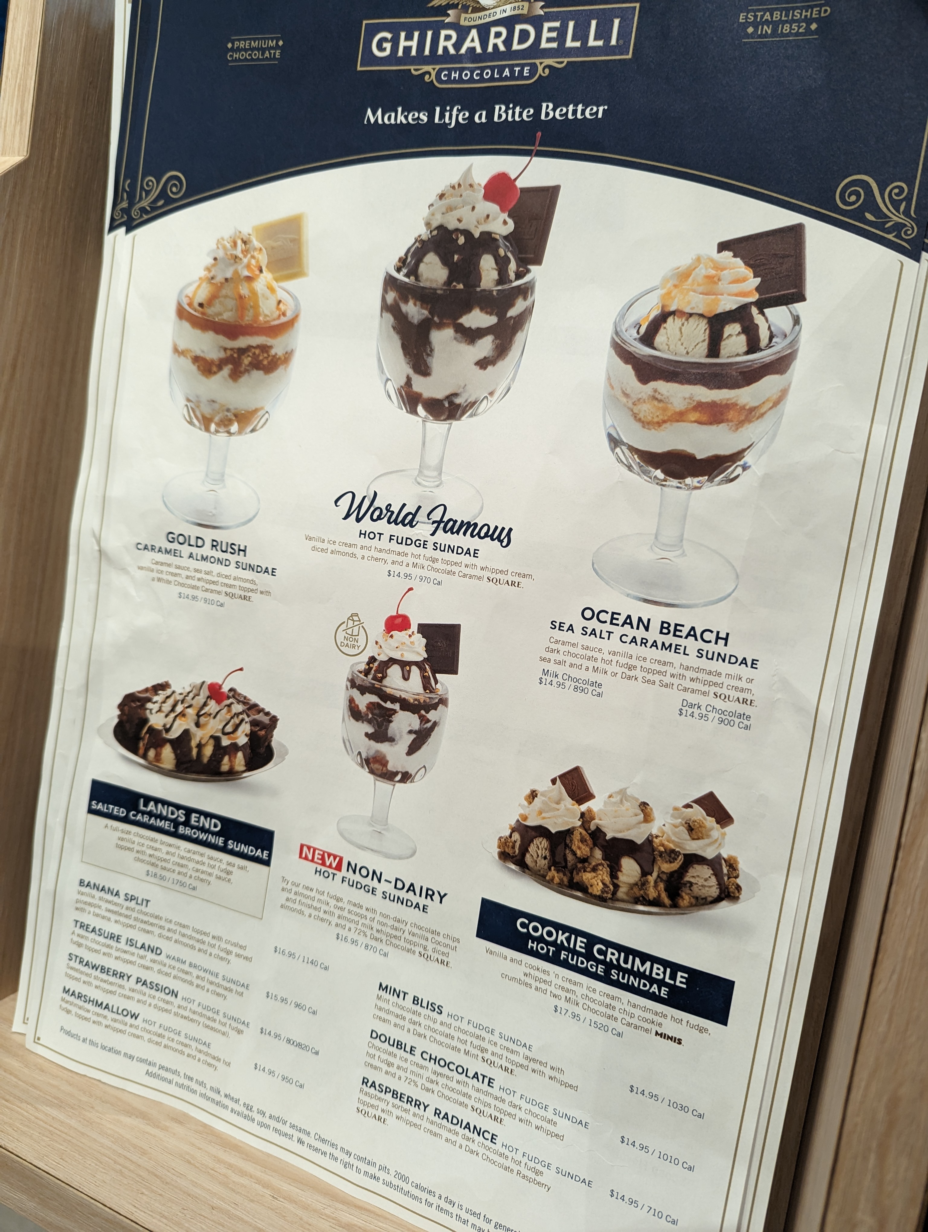 가격은 기본적으로 15달러 이상이네요. 요즘 미국 물가가 이렇죠. 날도 쌀쌀하고 줄도 길어서 굳이 먹어보진 않았어요. 기랄델리 좋아하시면 한번 드셔봐도 좋을 것 같아요.