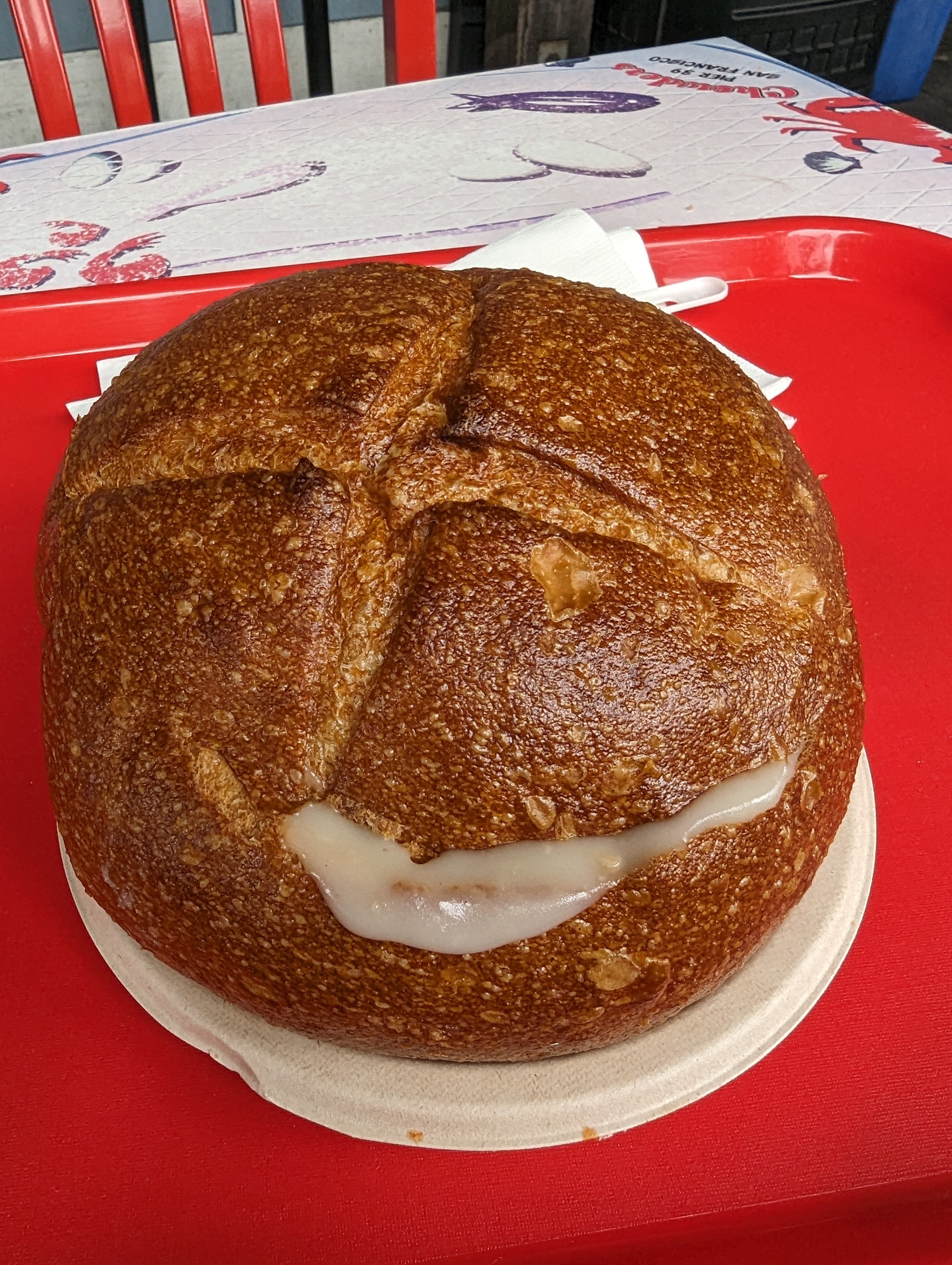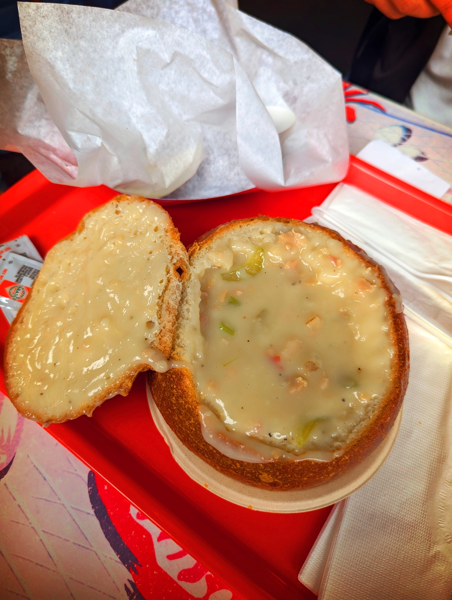 브레드보울에 담긴 클램차우더에요. 양이 많아서 나눠먹길 잘한 것 같아요.