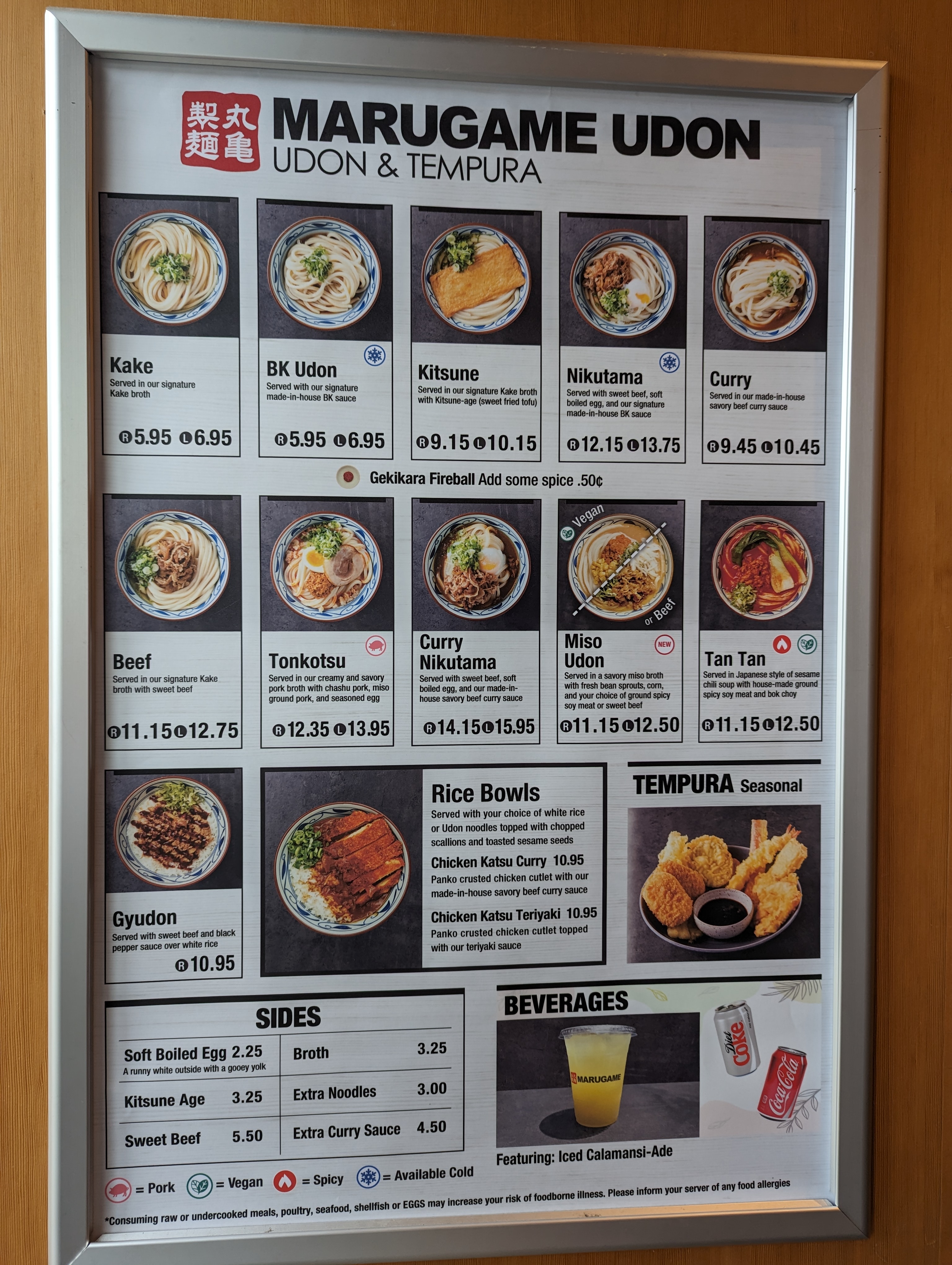 이건 돈코츠 라멘 국물에 우동면을 넣은 신기한 조합이에요. 사실 저는 일본에 사는 십여년동안 마루가메 제면에 가본 적이 없어서 현지 마루가메에 이 메뉴가 있는지도 모릅니다만 이 조합 자체를 일본 현지에서 본 적이 없어요. 일본에서 돈코츠 라멘은 라멘면으로만 먹으니까요. 아마 미국시장을 위해 개발한 메뉴가 아닐까 싶네요.