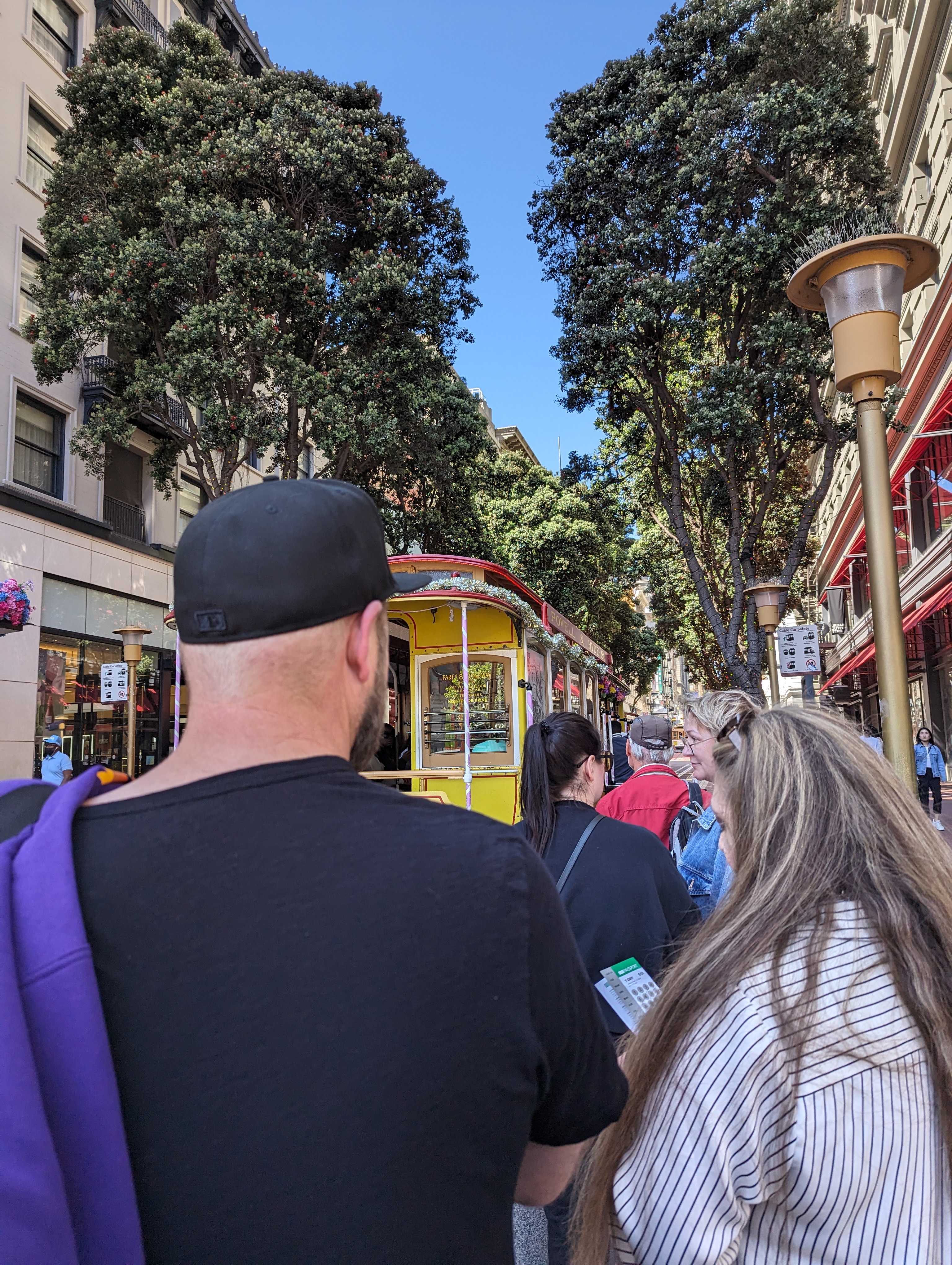 저희는 Nob hill 근처에서 다행히 시간이 맞아 Powell 행 케이블카를 한번 더 탈 수 있었는데요, 당연히 좌석은 만석이었지만 안쪽에서 서서갈 수 있는 공간이 조금 남아 있어서 안전하게 타고 내려왔어요. 저녁 시간대라서 낮보다는 덜 붐비는 것 같아요.