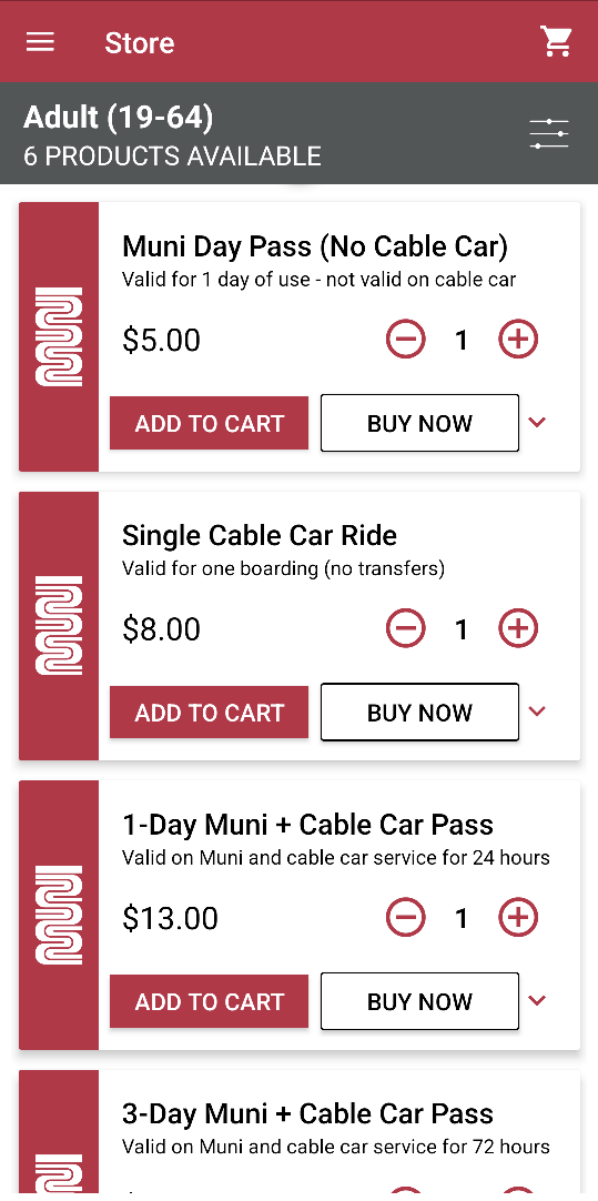 뮤니 앱에서 확인 가능한 케이블카 탑승권 및 뮤니 데이패스 가격입니다. 케이블카 없이 뮤니만 데이패스를 해도 5달러면 되는데 케이블카 한번에 8달러는 좀 많이 비싼 것 같아요. 이렇게 비싸게 받아도 사람이 몰리니까 굳이 가격을 내리지는 않나 보내요. 저는 13달러 내고 뮤니 데이패스+ 케이블카 티켓으로 샀어요.