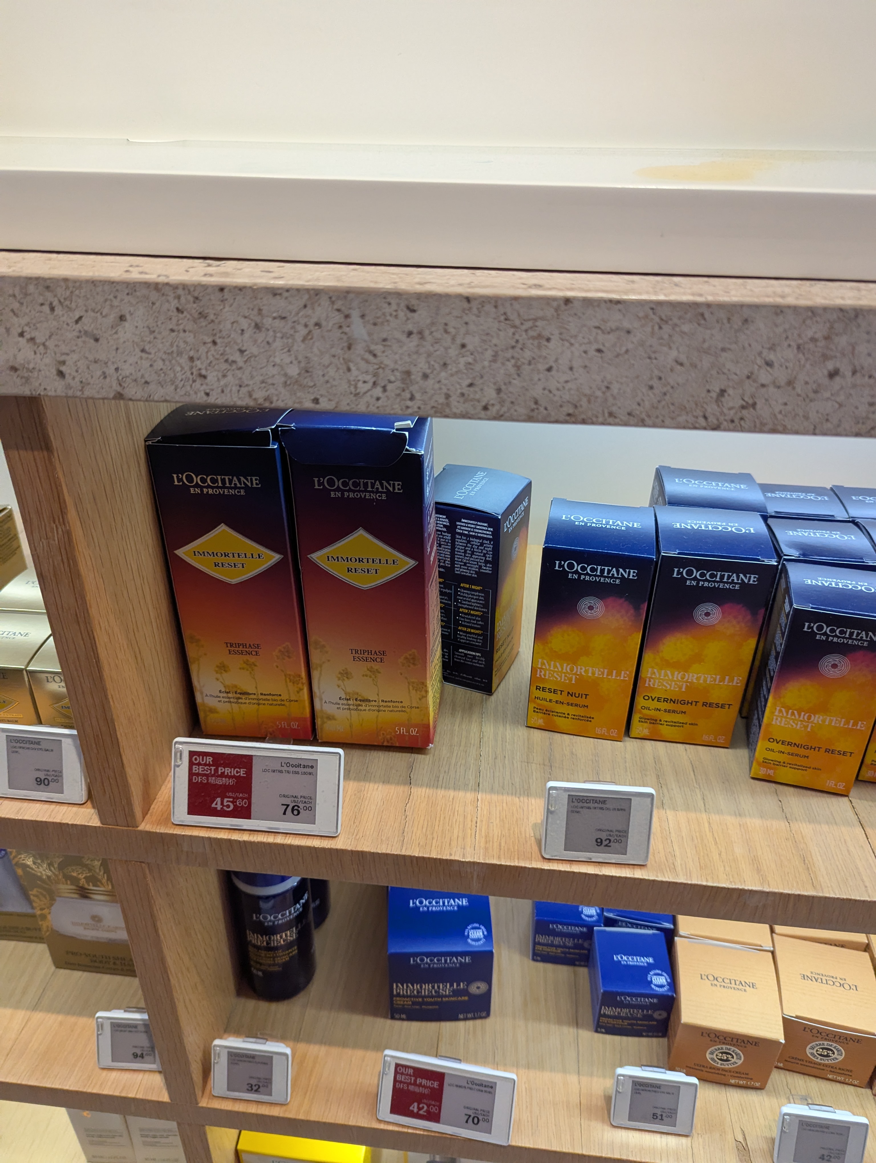 록시땅도 부분적으로 프로모션 제품이 있어요. 이모르뗄 리셋 트리페이스 에센스 정상가 76달러 세일가 45달러에요. 한국 면세점에서는 53달러라고 하니 이 제품은 의외로 샌프란 면세점이 더 좋은 가격일수도 있어요. 이모르뗄 프레셔스 크림도 70달러 제품 42달러에요 세일중입니다. 다만 상자 상태가 애매한걸로 봐서 유효기한이 임박해 있을 수도 있고 선물용으로는 난감하실 수도 있다는 점 참고해주세요. 가격은 괜찮은데 한국 면세점처럼 깔끔하게 포장되어 있지 않아서 아쉬워요.