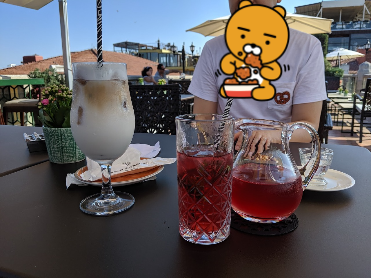 서비스도 친근하고 괜찮고요, 옥상 테라스의 전망도 좋아요. 한가지 단점은 테라스라서 에어컨은 없고 규모가 조금 좁은 편입니다. 사람이 많지 않아서 크게 불편을 느끼진 않았지만 몇시간 편하게 앉아서 수다를 떨기에는 조금 더웠어요. 저희처럼 더운 날에 가신다면 테라스에서는 커피만 드시고 로비와 정원에서 더 많은 시간을 보내시는 것도 좋은 방법입니다. 오스만 투르크 제국의 옛 화려한 영광을 문화유적에서도 접했지만 깨끗하게 현대식으로 정리해 둔 포시즌스에서도 굉장히 인상깊게 느꼈어요.