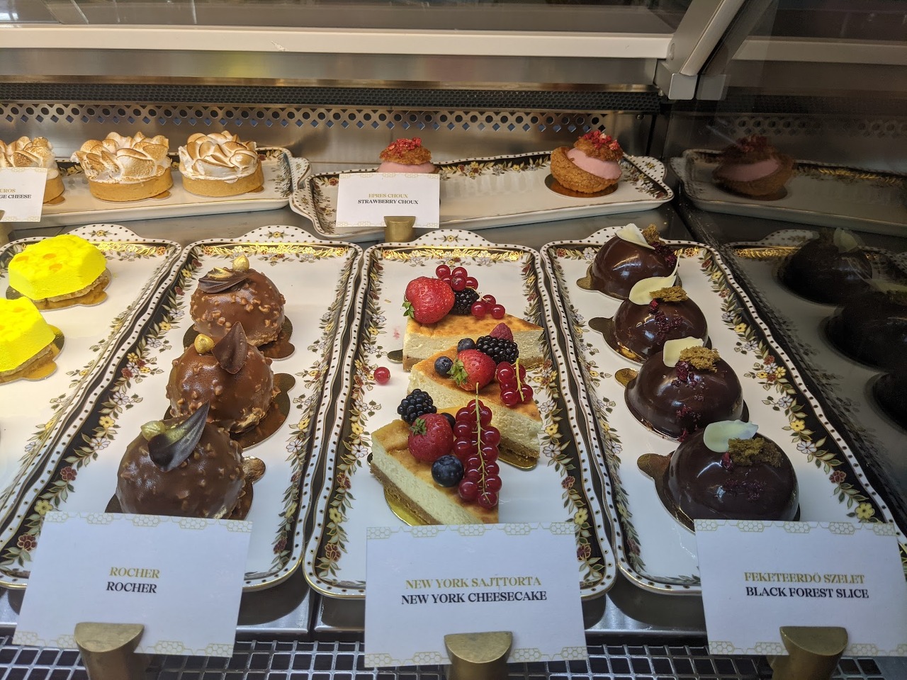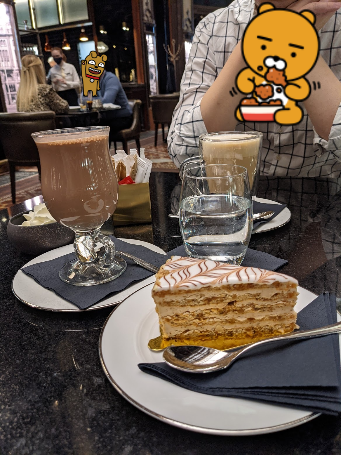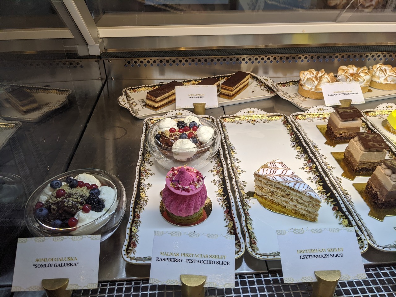 헝가리에서 유명하다는 꿀 케이크와 음료수 두잔 시켰더니 (헝가리 포린트 환율에 따라 달라지겠지만) 20유로 상당 나왔던 것 같네요. 케이크는 좀 너무 달아서 강력 추천드리지는 않지만 저희도 그냥 궁금해서 먹어본 거에요. 원래 두조각 시키려다가 한조각이 매진되서 한조각만 먹은 건데 안먹은 한조각이 매진된 것이 다행이라고 생각했어요.