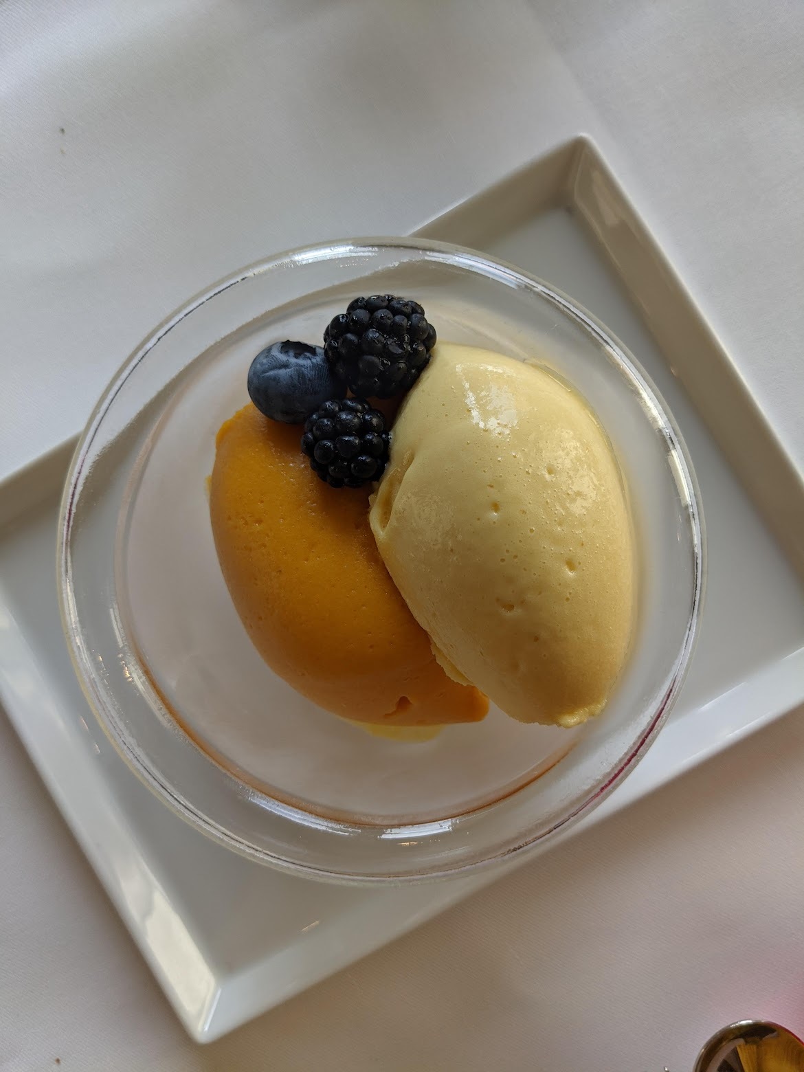 마지막으로 작은 디저트 하나 시키고 마무리했습니다. 일반적으로 아시는 고급 아이스크림 맛이에요. 당연히 이탈리아 현지 젤라또의 맛은 아니지만 식사를 워낙 만족스럽게 해서 서비스료 차원에서 주문했어요. 전체적으로 상당히 만족스러웠던 곳입니다. 동화책 마냥 화려한 프라하의 모습에 비하면 오히려 너무 현대적인 느낌이 풍기던 포시즌스였지만 식사만큼은 제가 가본 호텔 식당뿐이 아닌 웬만한 미슐랭 식당들과 견주어보아도 손색이 없다고 느꼈어요. 물론 개인의 취향입니다. 프라하처럼 가성비를 생각하고 가는 곳일 수록 오히려 이런 고급 식당들이 만족도에 비해 의외로 저렴한 것 같아요. 프라하에 가신다면 당연히 추천드립니다.
