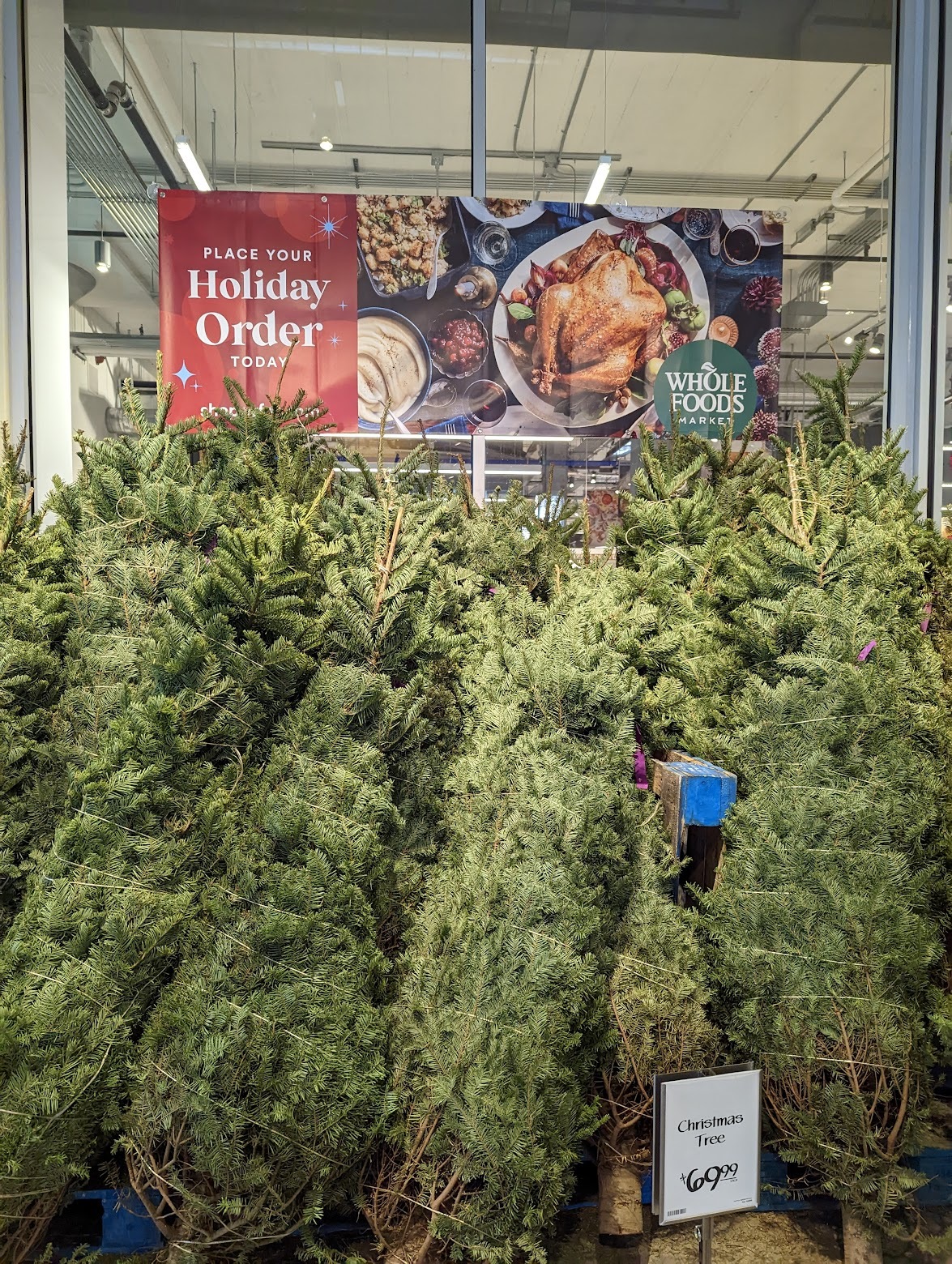지난번 포스팅에서 말씀드린 진짜 나무를 홀푸즈에서 보여드리게 되었네요. 70달러면 진짜 나무와 함께 크리스마스를 보내실 수 있습니다. 처리가 좀 귀찮긴 하지만 연말연시를 자연의 나무향을 맡으며 즐길 수 있지요.